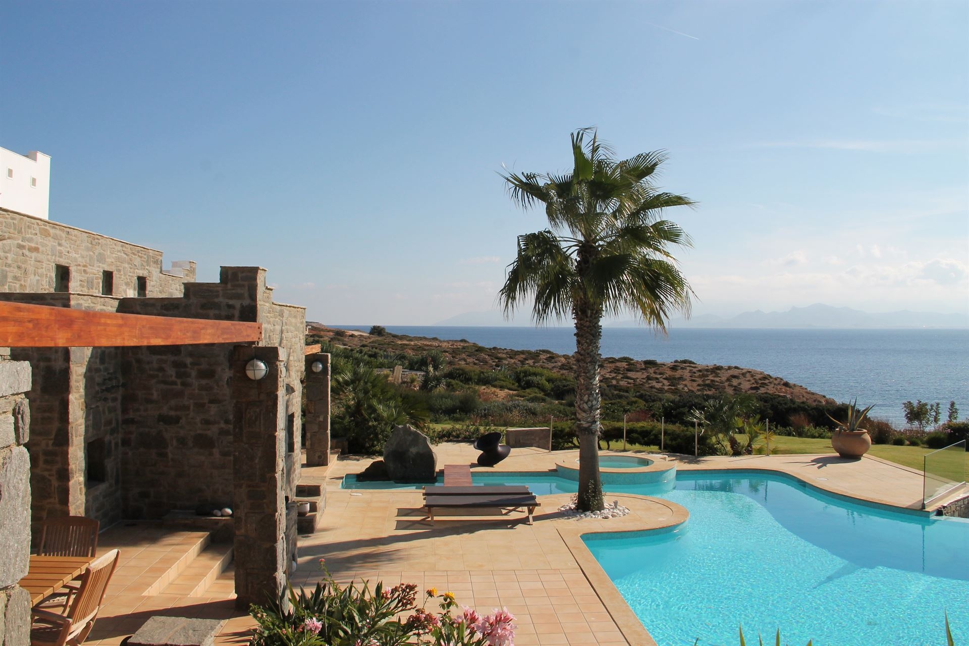 As you enter Villa Aesthisis, you will be greeted by beautifully manicured gardens and a serene atmosphere. The centerpiece is the magnificent infinity pool. This pool invites you to take a refreshing dip while enjoying panoramic views of the azure sea and lush countryside.