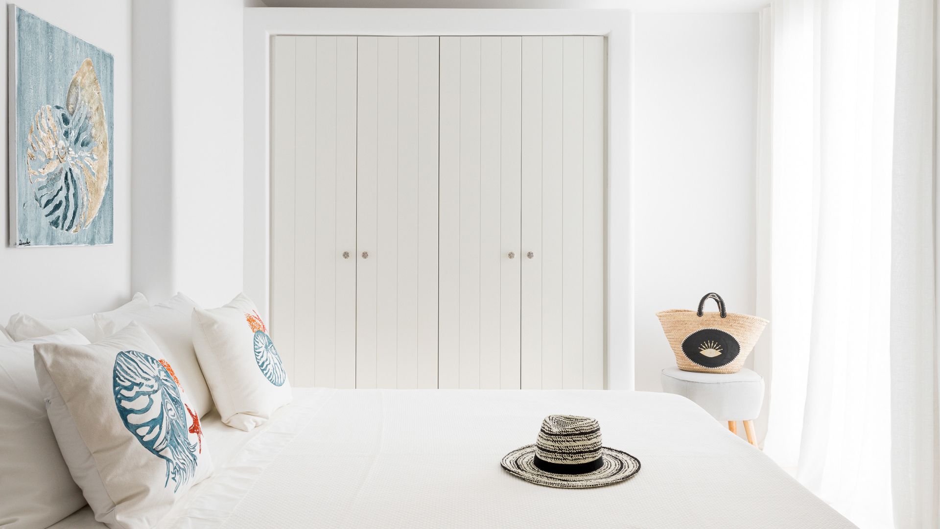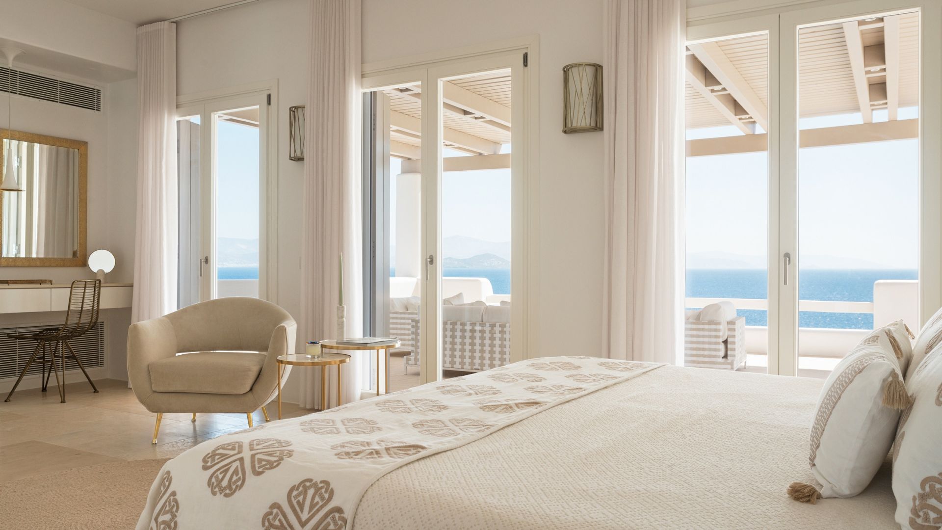 One bedroom with king-size bed, en suite bathroom, balcony with sea view