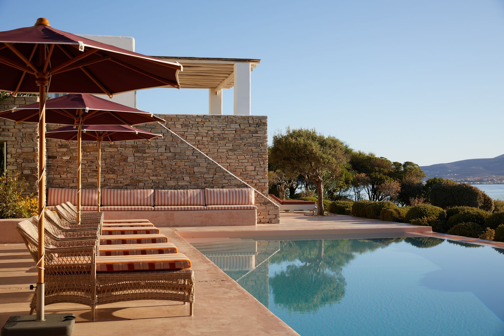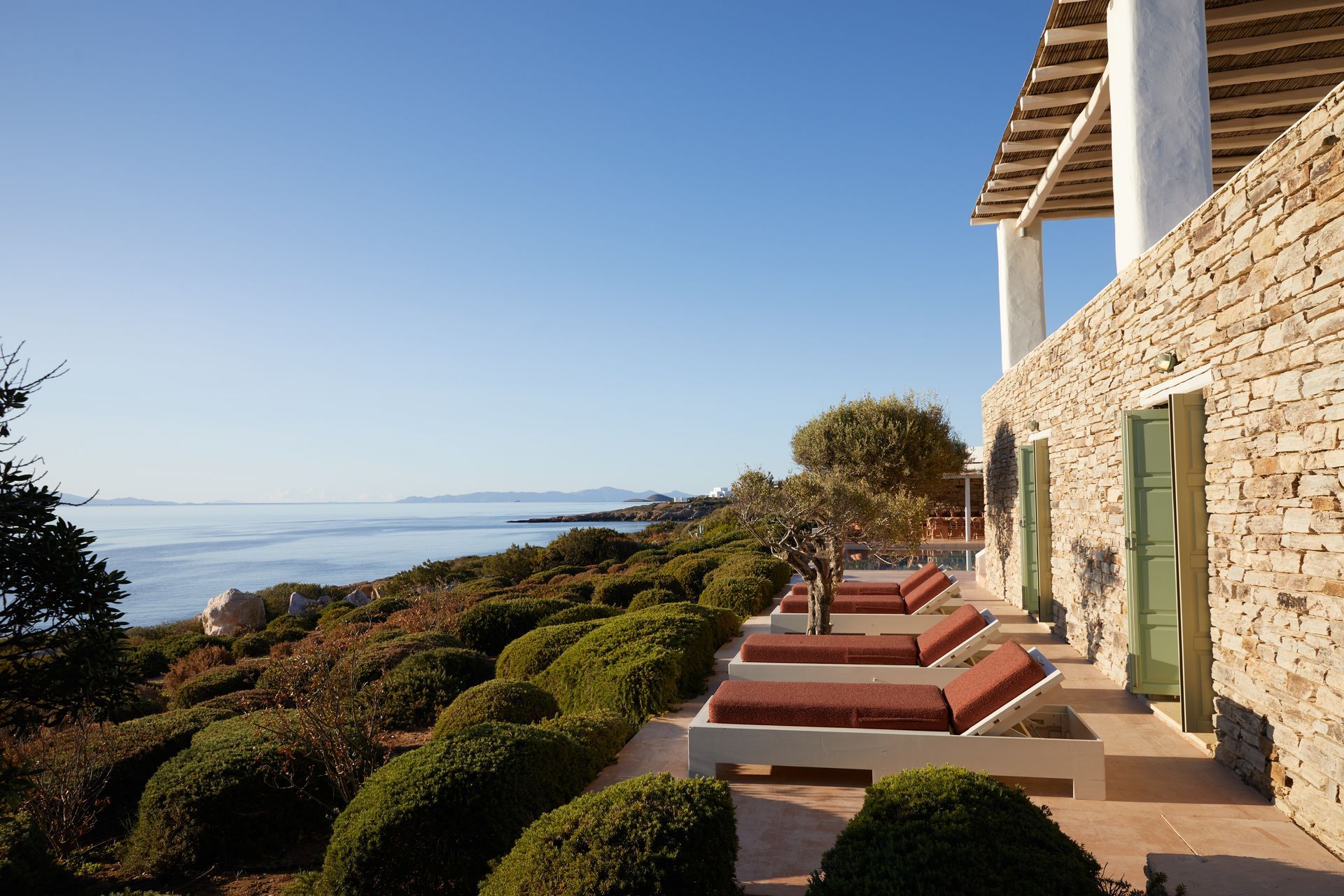 The outdoor areas are designed for relaxation and enjoyment of the Aegean panorama. The infinity-edge pool appears to merge with the horizon, while sun-soaked terraces and shaded pergolas provide inviting spots for lounging, reading, or simply enjoying the sea breeze. Mediterranean gardens, filled with aromatic herbs and native plants, frame the property, and a barbecue area offers a relaxed setting for outdoor dining. The complex features a private Wellness Studio with fitness equipment and a massage bed, along with tennis and basketball courts. Guests can also take a short walk to two nearby sandy and pebble beaches, or enjoy the estate’s exclusive private beach.