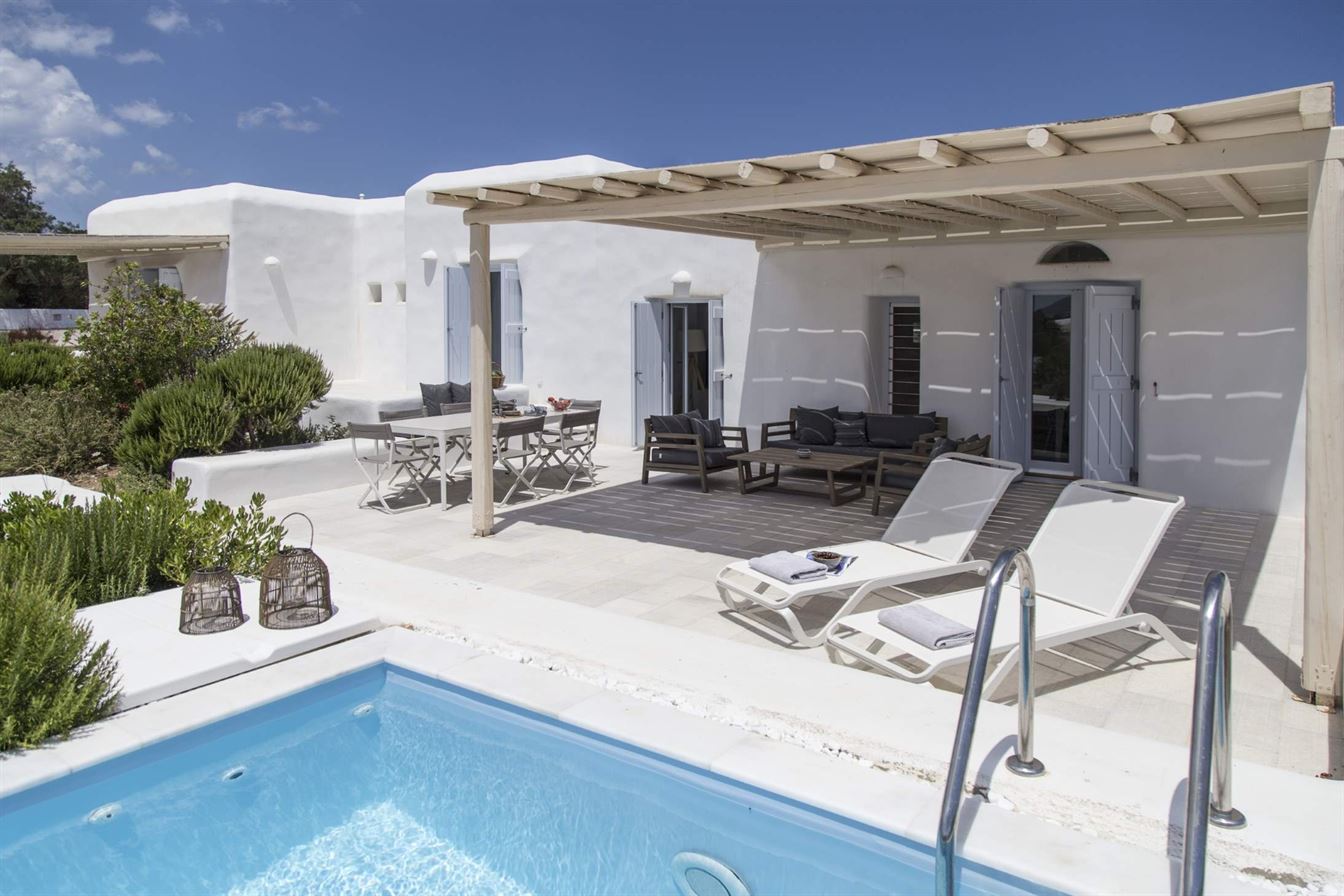Step into the spacious outdoor area, where a large veranda surrounds the Coastal Retreat Five luxury villa in Paros, offering a plunge pool perfect for relaxing while gazing at the infinite blue. With ample seating and views of the Aegean, this terrace is ideal for peaceful mornings and sunset gatherings alike.