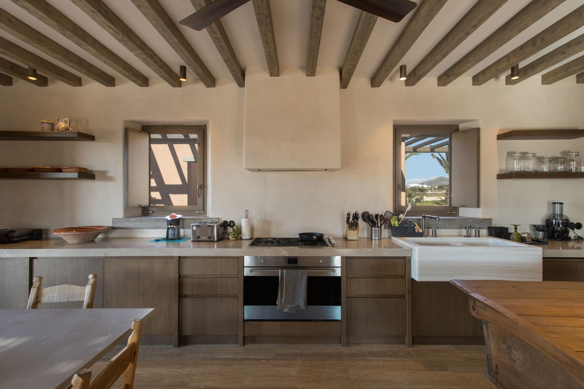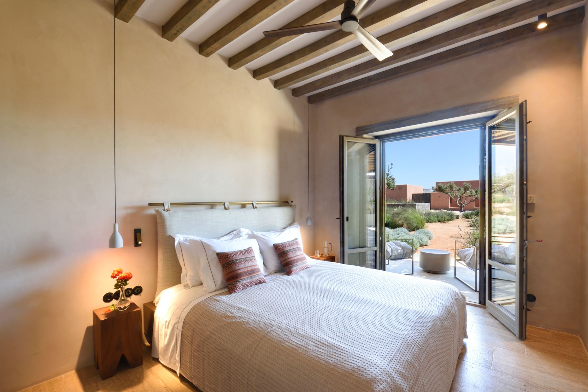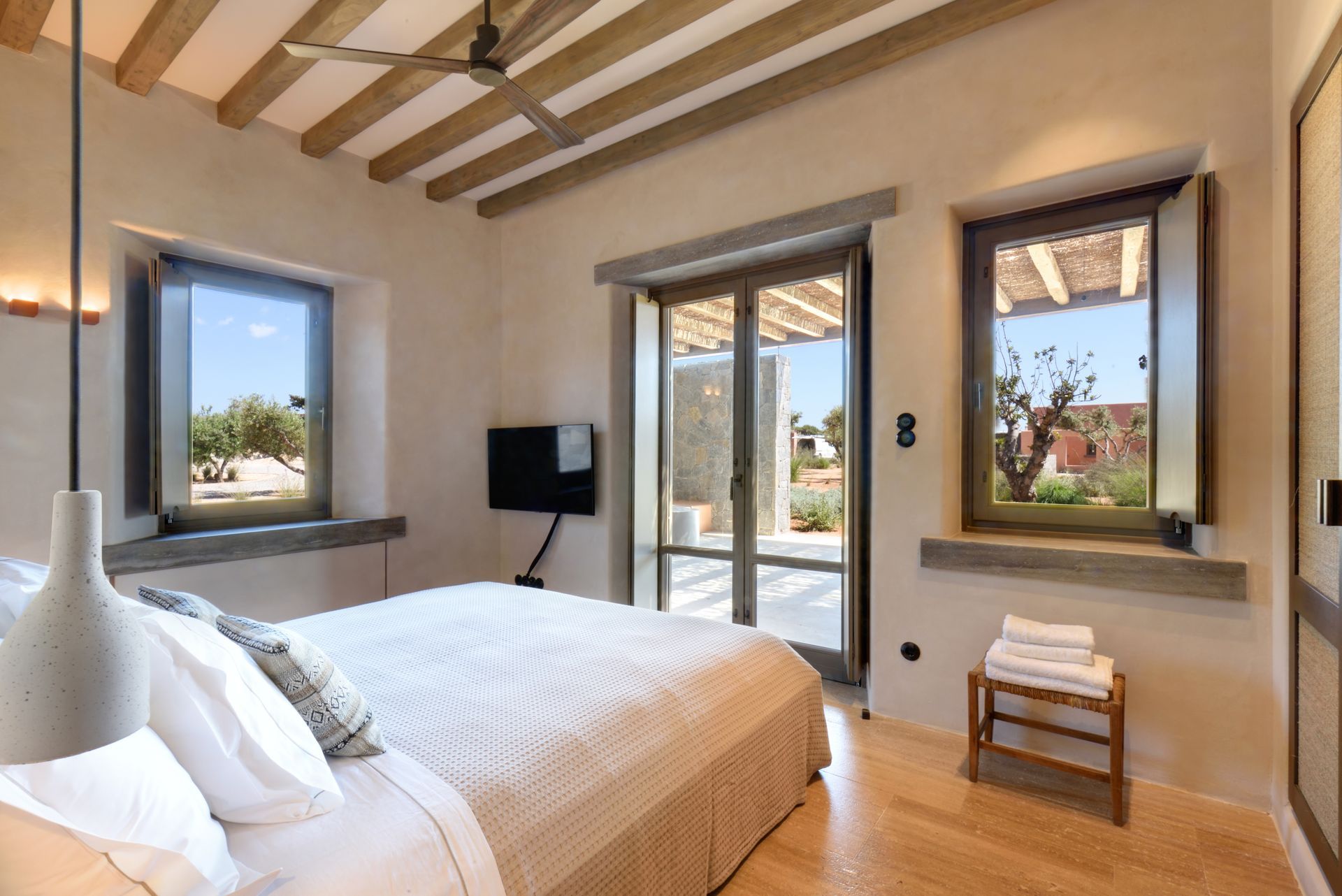 At the interior of Villa Coral Two in Paros, the villa features four beautifully appointed bedrooms, each with direct access to a private outdoor terrace with shaded seating areas. Two en suite master bedrooms with super king-size beds offer luxurious comfort, while the remaining two bedrooms, which can be configured with super king-size or twin beds, share a stylish bathroom. The open-plan living and dining area, with a large sofa and fireplace, creates a cozy atmosphere, while the fully equipped kitchen opens to an outdoor dining area with a gas barbecue, perfect for al fresco meals.