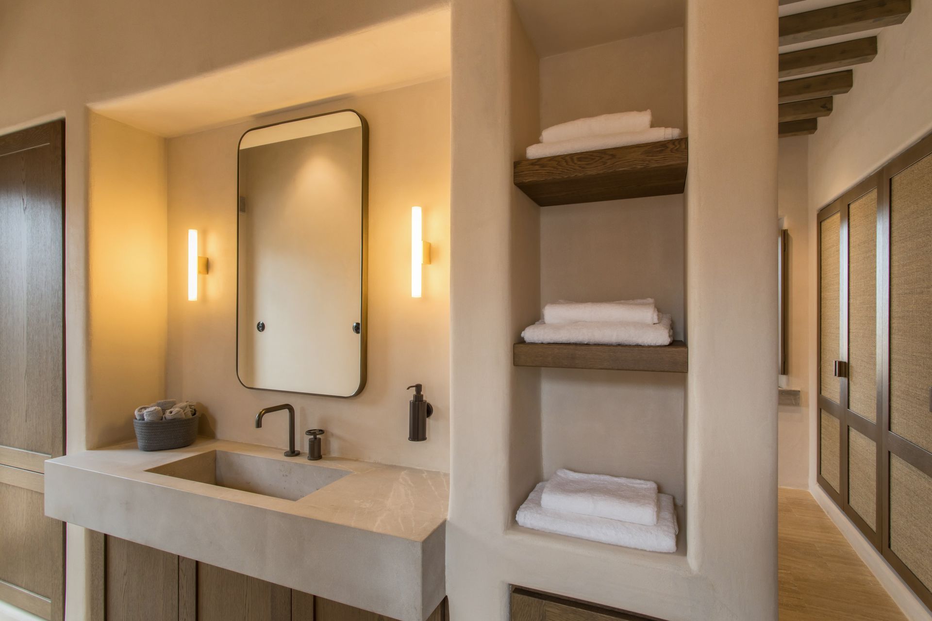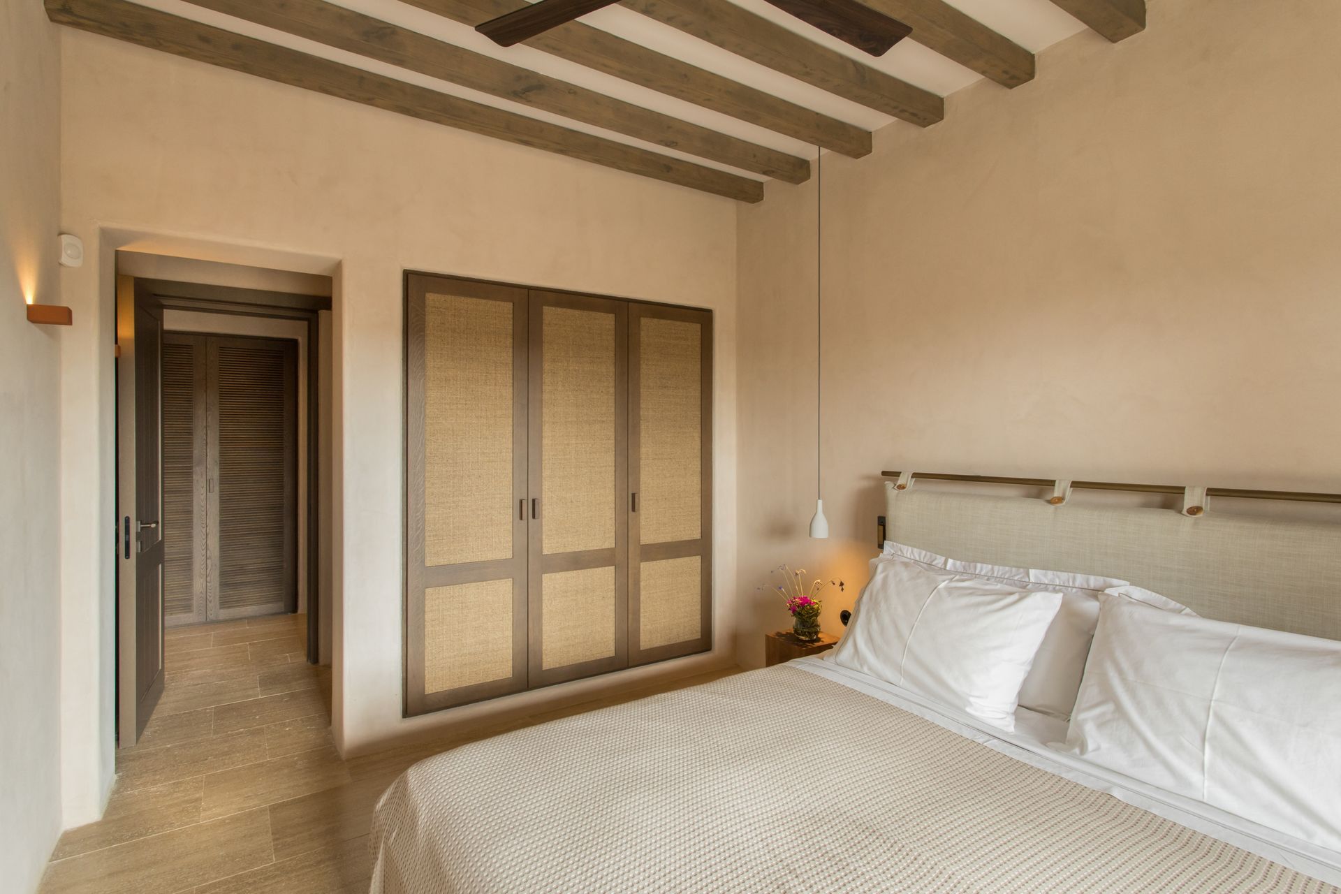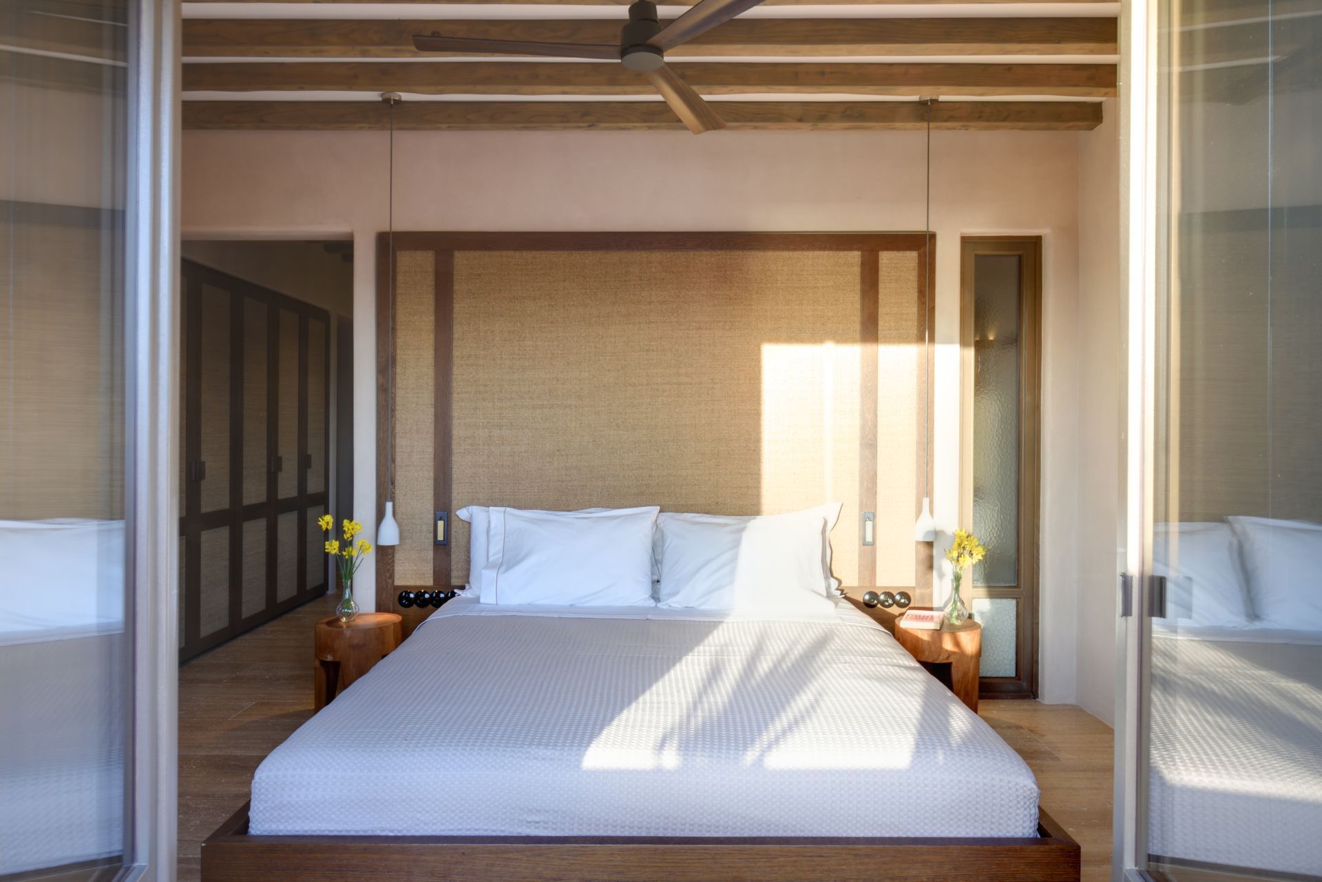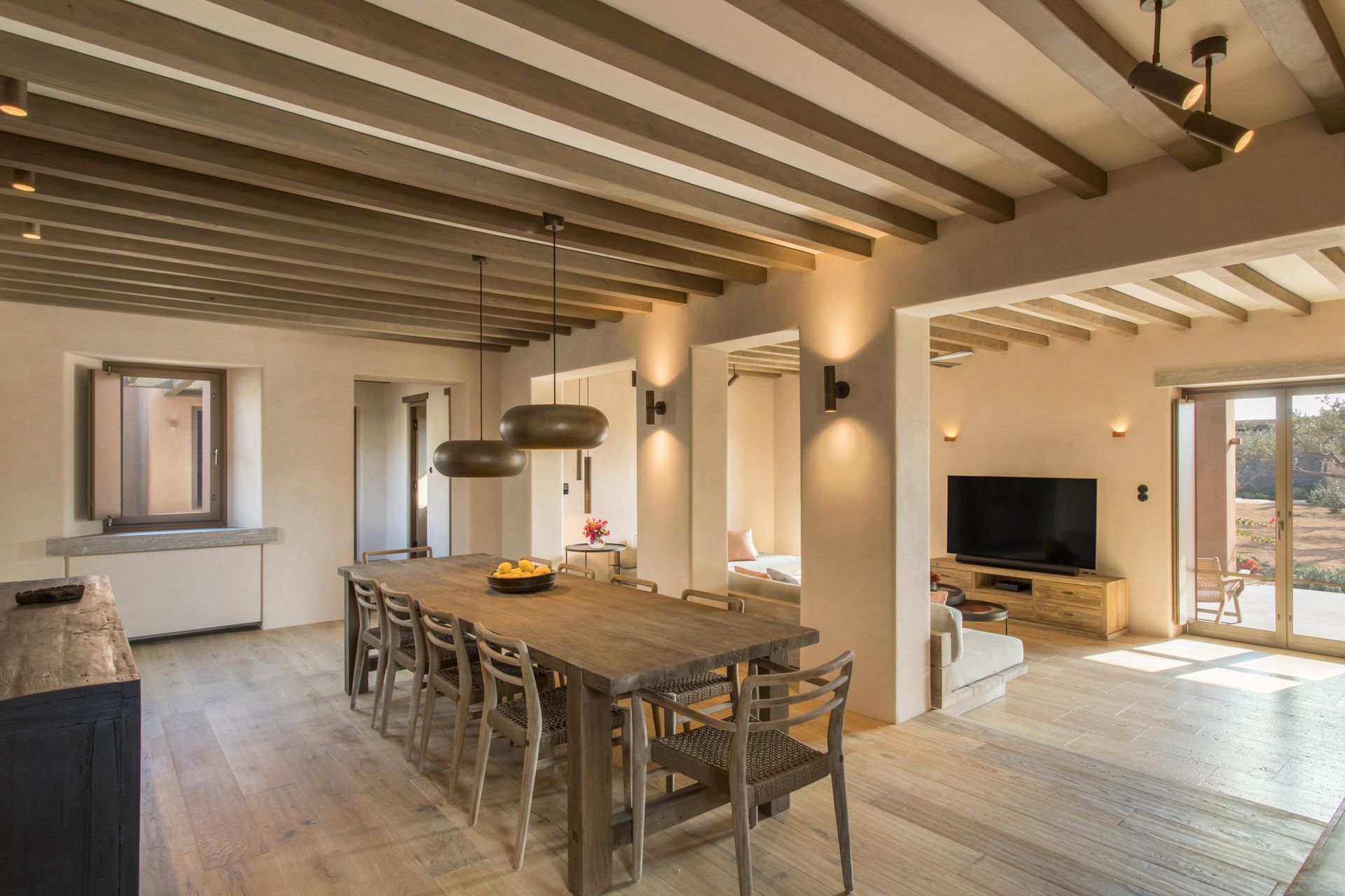 At the interior of Villa Coral Two in Paros, the villa features four beautifully appointed bedrooms, each with direct access to a private outdoor terrace with shaded seating areas. Two en suite master bedrooms with super king-size beds offer luxurious comfort, while the remaining two bedrooms, which can be configured with super king-size or twin beds, share a stylish bathroom. The open-plan living and dining area, with a large sofa and fireplace, creates a cozy atmosphere, while the fully equipped kitchen opens to an outdoor dining area with a gas barbecue, perfect for al fresco meals.