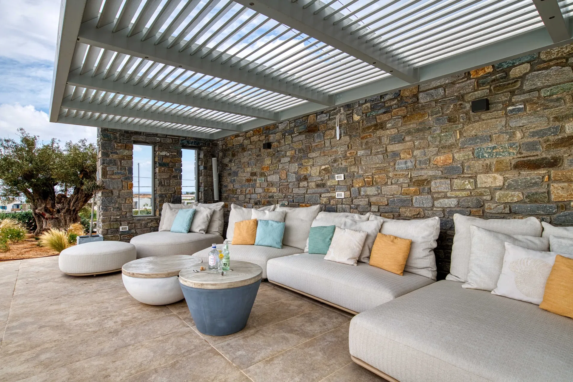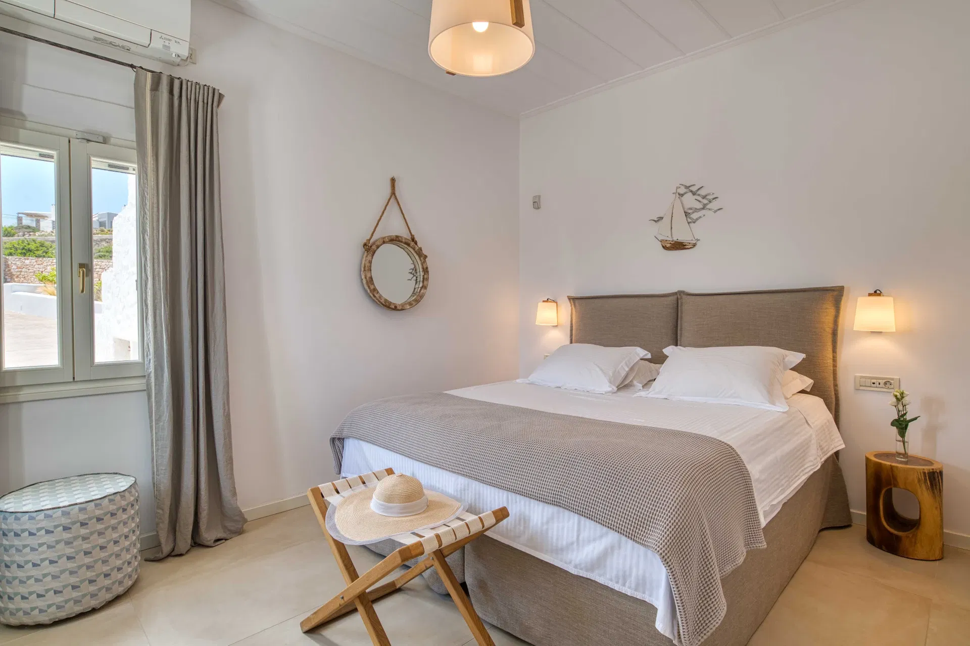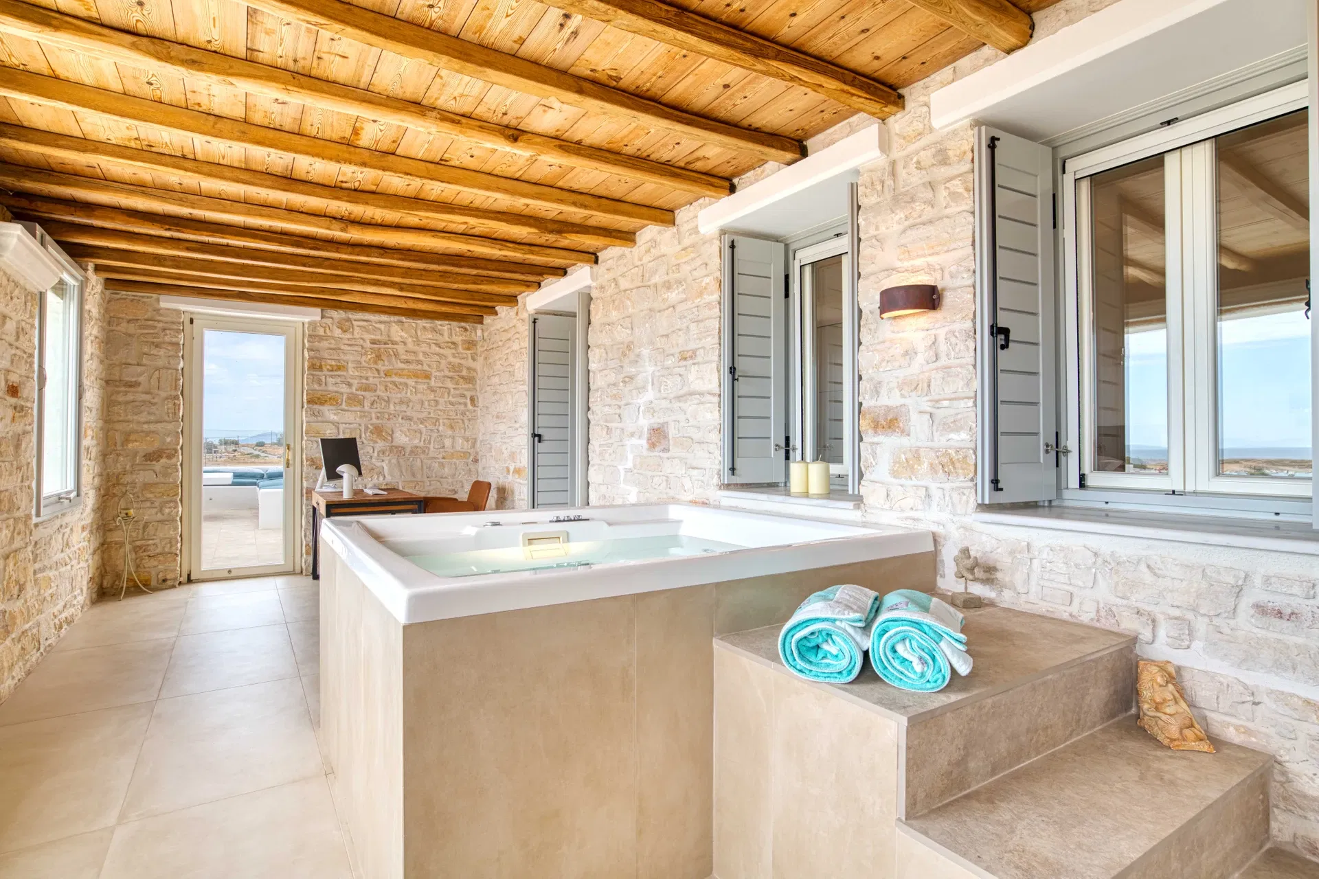 Outdoors, Villa Estelle opens into thoughtfully designed spaces that invite you to slow down and enjoy the island lifestyle. A private swimming pool sits at the heart of the property, ideal for refreshing swims throughout the day, while the sea-view Jacuzzi offers a relaxing spot to unwind and take in the surroundings. The villa is framed by a well-maintained garden, creating a calm and private setting with multiple areas to sit back and enjoy the Paros sun or a quiet evening outdoors.