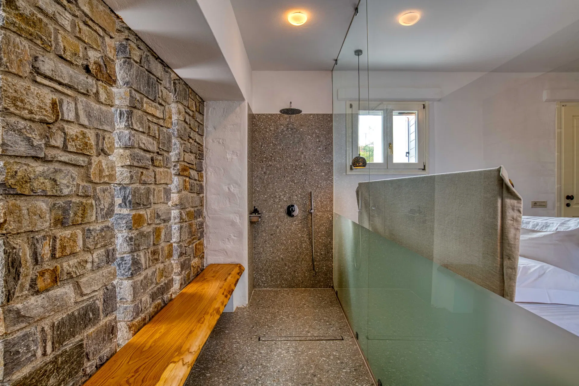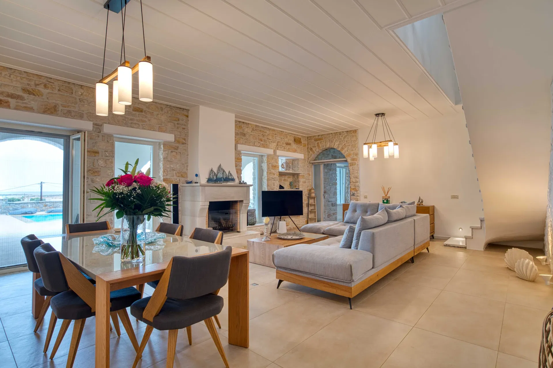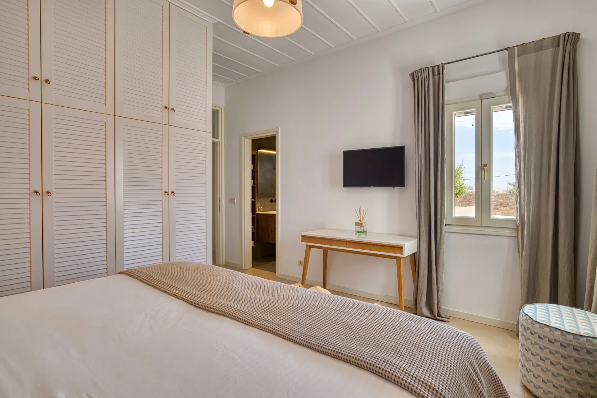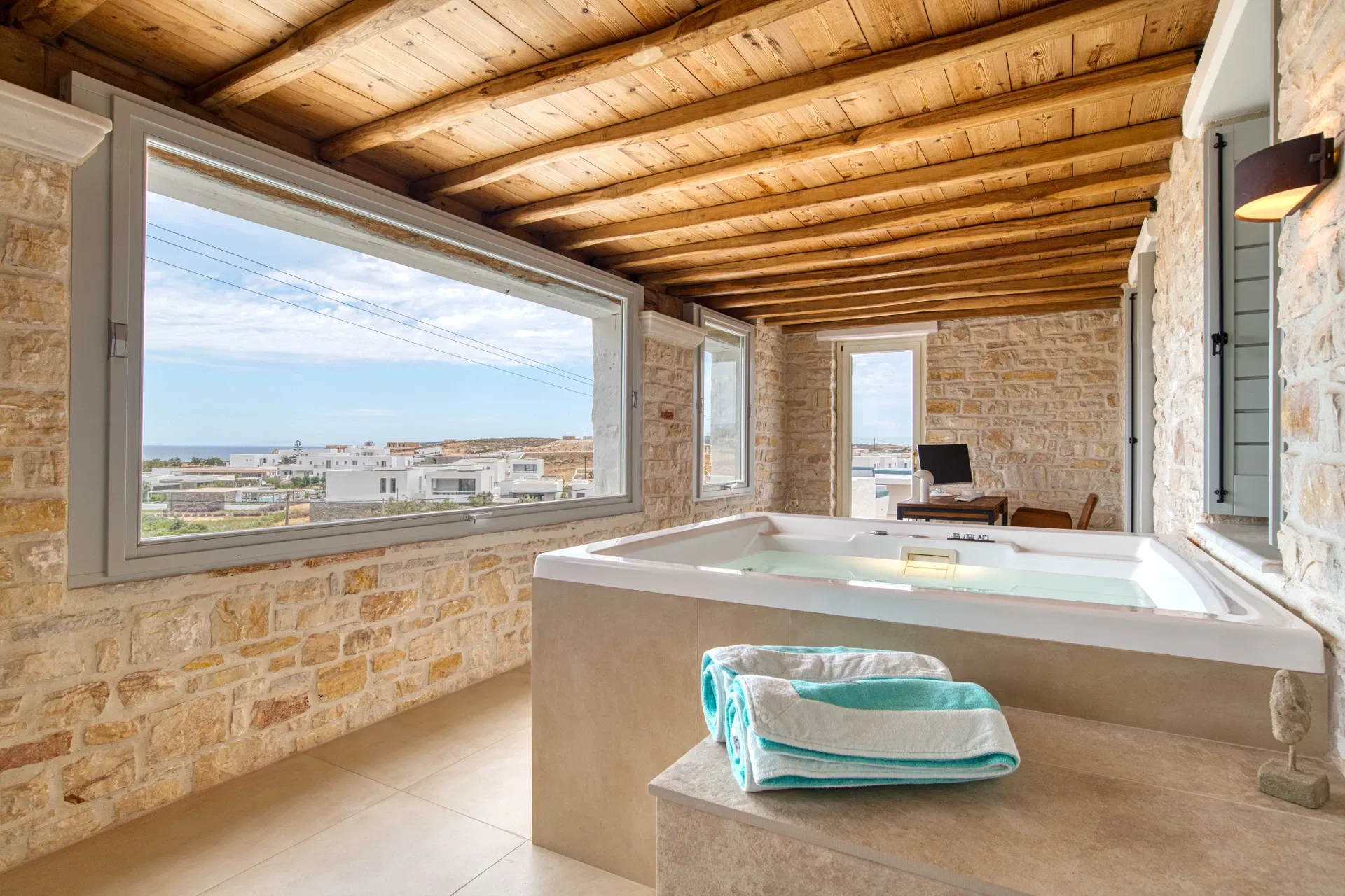 Outdoors, Villa Estelle opens into thoughtfully designed spaces that invite you to slow down and enjoy the island lifestyle. A private swimming pool sits at the heart of the property, ideal for refreshing swims throughout the day, while the sea-view Jacuzzi offers a relaxing spot to unwind and take in the surroundings. The villa is framed by a well-maintained garden, creating a calm and private setting with multiple areas to sit back and enjoy the Paros sun or a quiet evening outdoors.