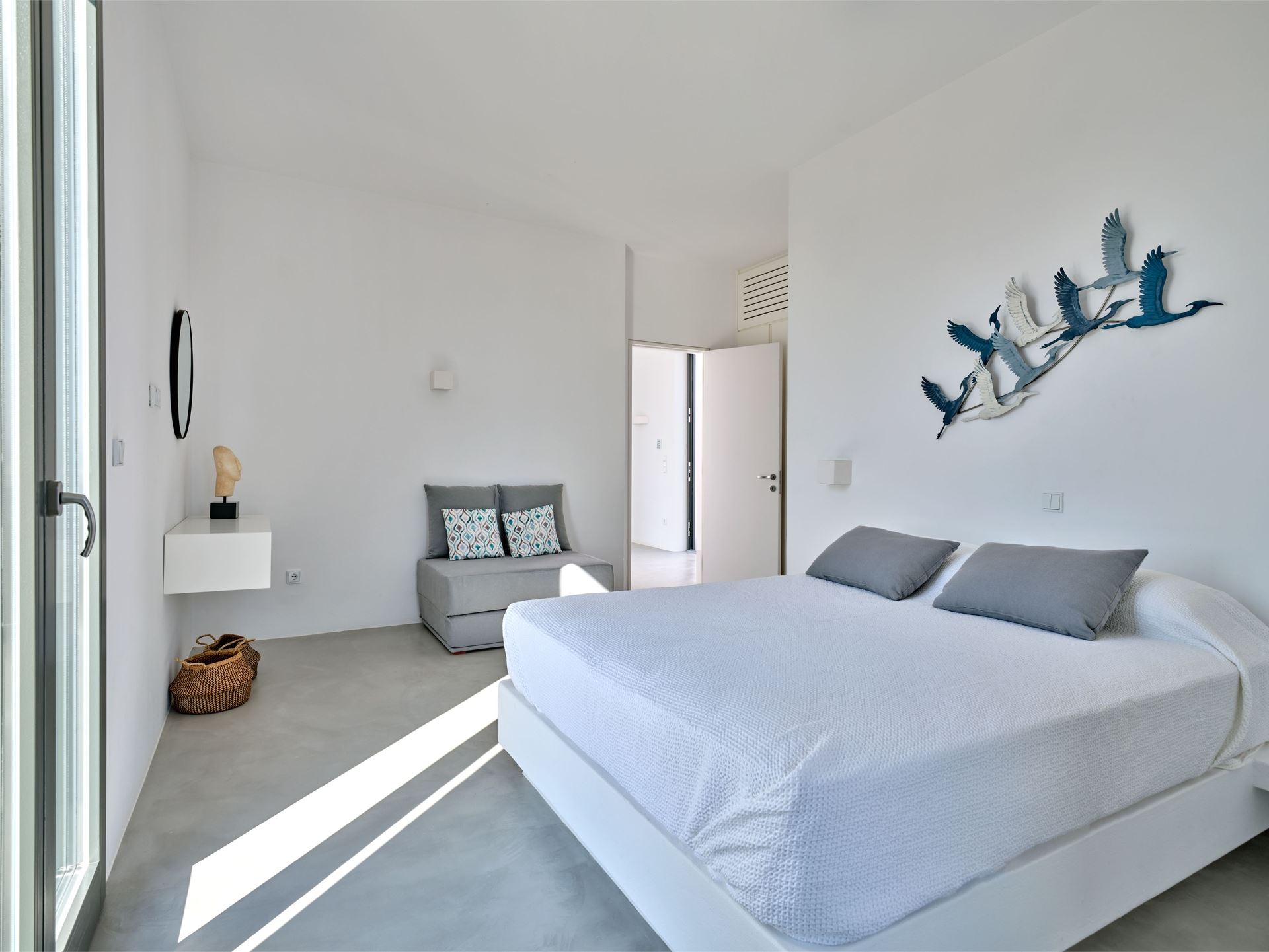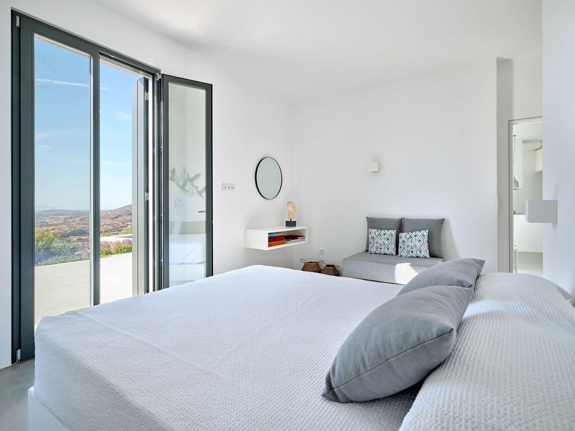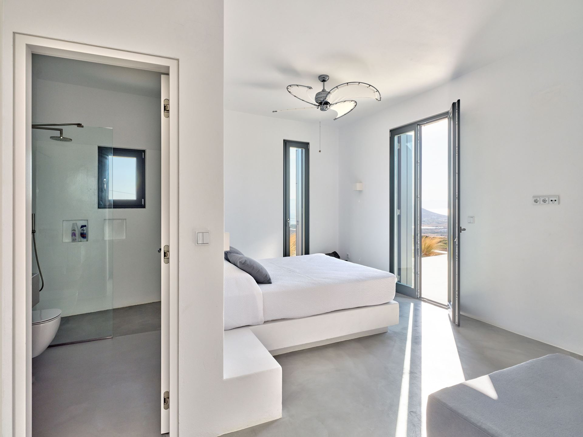 The villa’s single-level layout includes three en-suite bedrooms, with a master suite that opens onto a private balcony, offering uninterrupted views and natural light. A few steps down, a third en-suite bedroom is thoughtfully situated for added privacy, making Lithos Luxury Villa in Paros an ideal choice for guests seeking both comfort and independence. Each room features minimalist decor, large windows, and clean lines, enhancing the villa’s unique architecture.