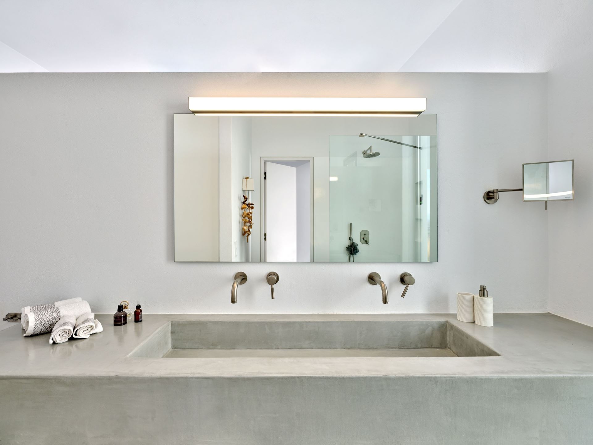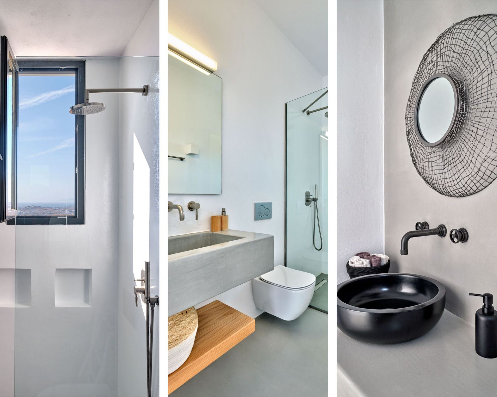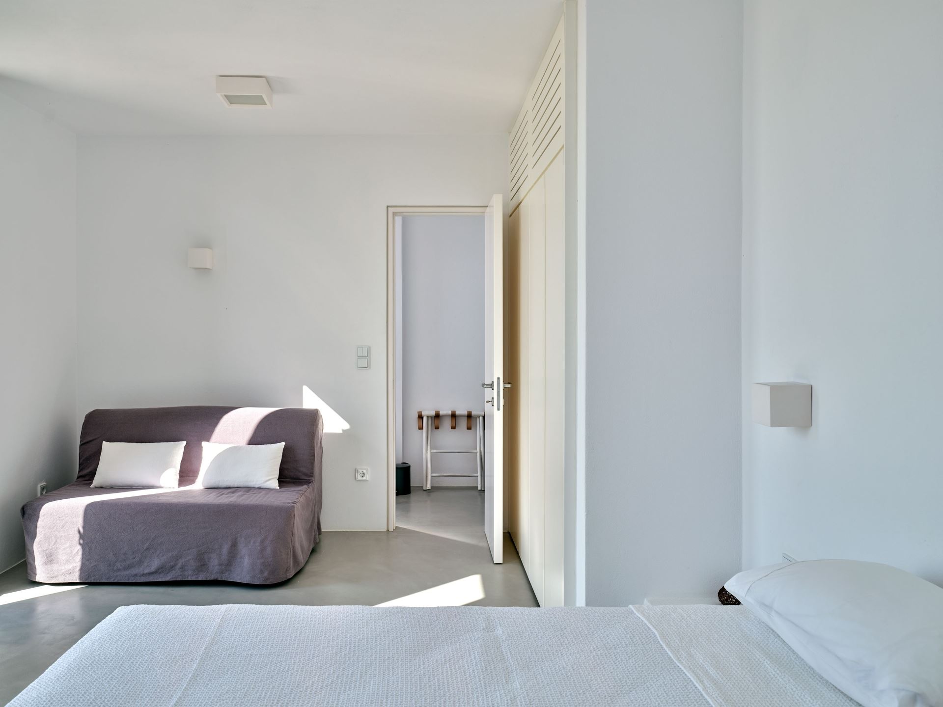 The villa’s single-level layout includes three en-suite bedrooms, with a master suite that opens onto a private balcony, offering uninterrupted views and natural light. A few steps down, a third en-suite bedroom is thoughtfully situated for added privacy, making Lithos Luxury Villa in Paros an ideal choice for guests seeking both comfort and independence. Each room features minimalist decor, large windows, and clean lines, enhancing the villa’s unique architecture.