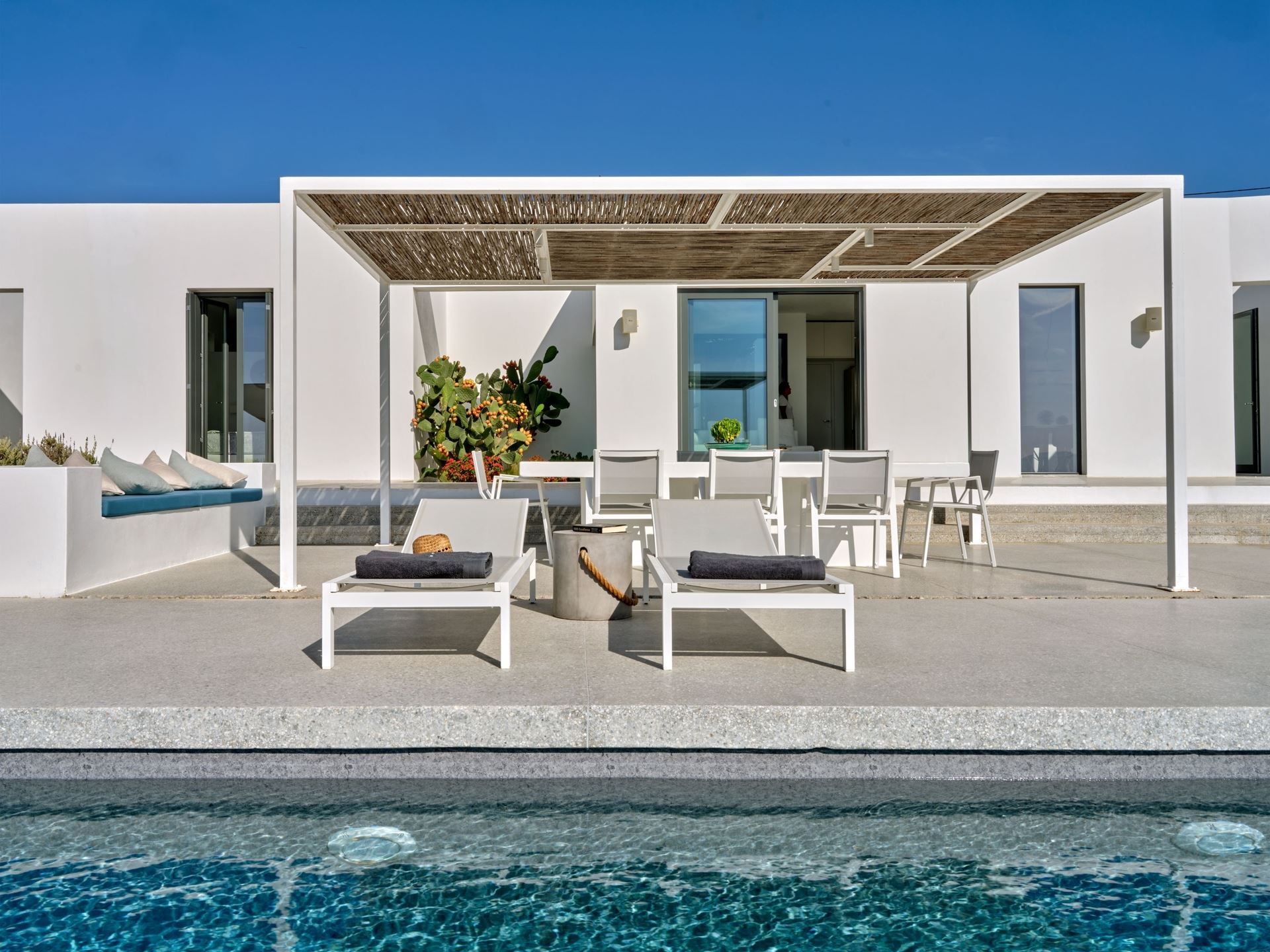 Lithos Luxury Villa’s open-plan living space includes a modern kitchen, fully equipped with top-of-the-line appliances and designed with simplicity and functionality in mind. The airy kitchen and living areas flow naturally outdoors, where pergolas, shaded seating, and multiple terraces create an inviting atmosphere for gatherings or peaceful relaxation.