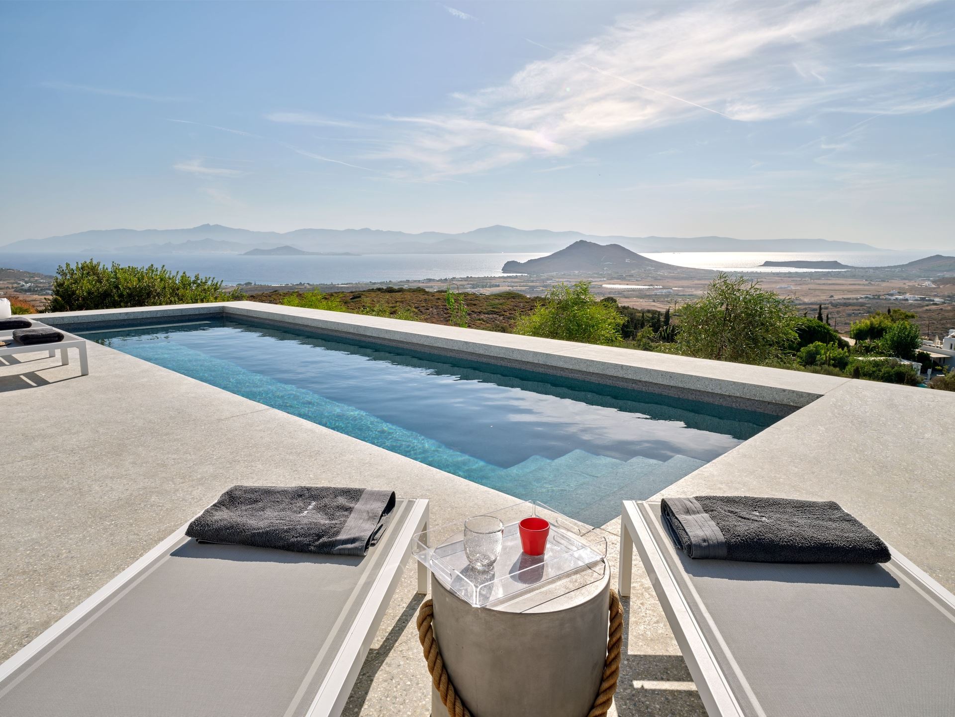 At the heart of Lithos Luxury Villa’s outdoor experience is a private pool surrounded by sun loungers, geometric landscaping, and breathtaking views. Guests can enjoy al fresco meals in the outdoor dining area, complete with a BBQ station, ideal for evenings under the stars. Every element of Lithos Villa in Paros has been crafted to offer an exquisite and exclusive getaway, blending luxury and tranquillity for an unforgettable stay in Paros.