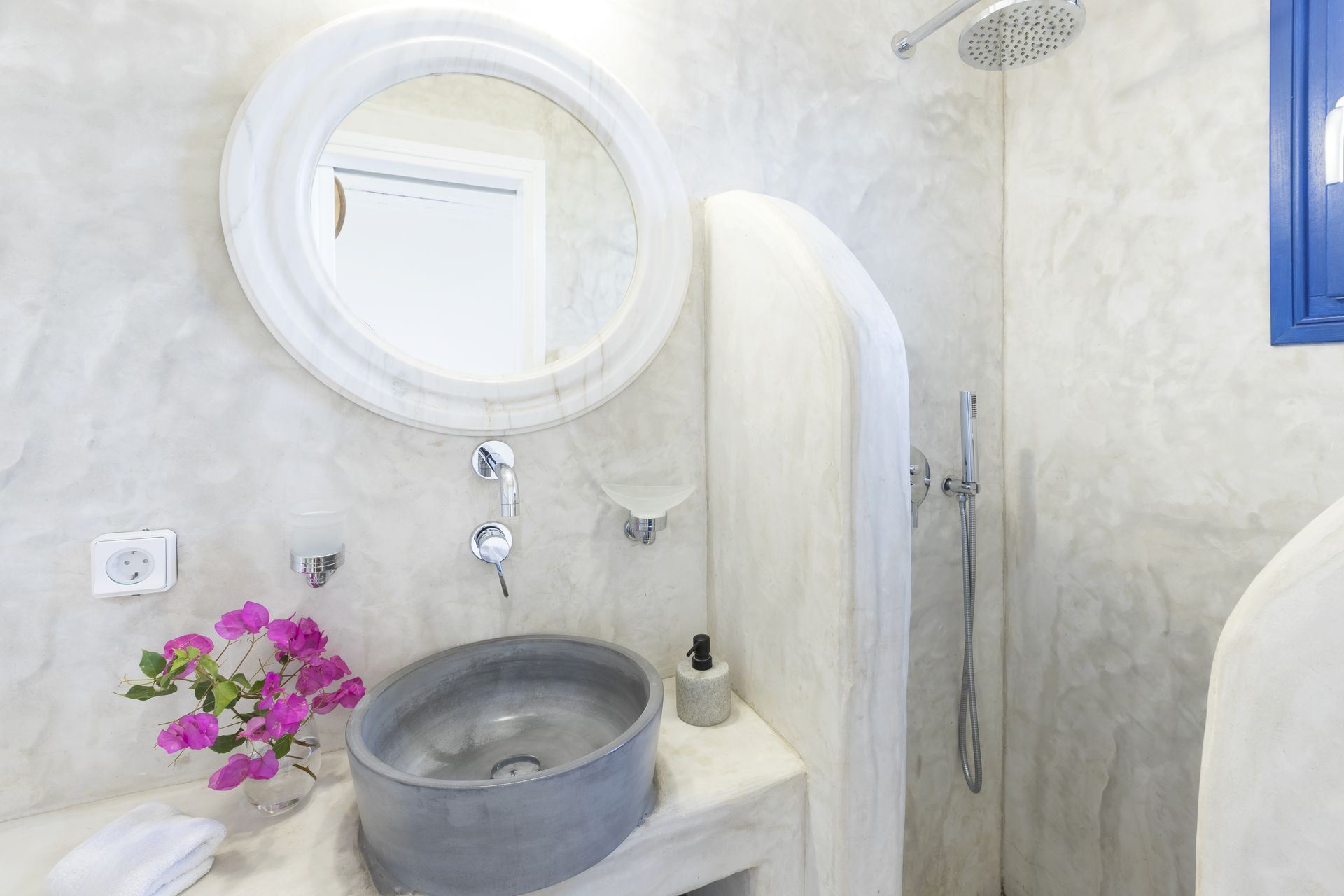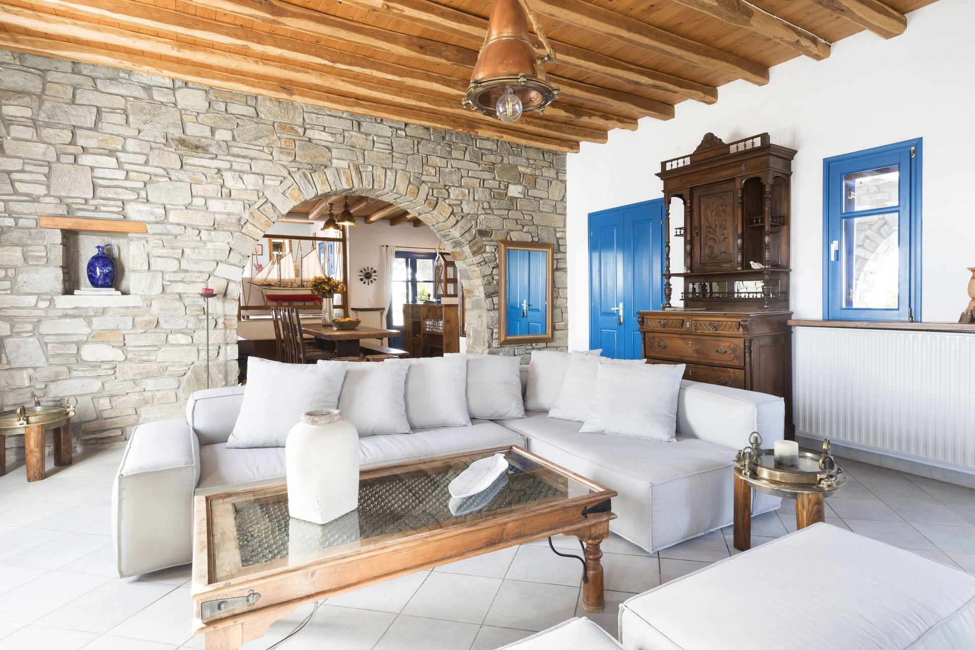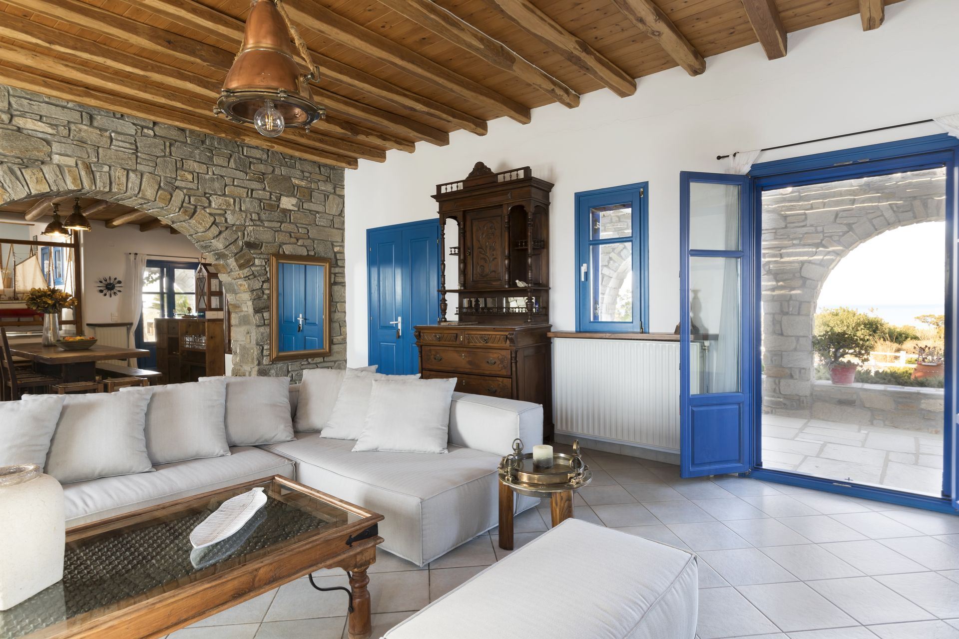 Beyond its luxurious interiors, Mare Villa in Paros invites guests to enjoy a range of activities. The private gym, lighted tennis court with changing rooms, single basketball court, and game room – complete with both American and French billiards, along with table tennis – provide ample options for active relaxation. Outdoors, a semi-private beach and a spacious terrace with shaded lounge areas create the ideal setting for unwinding by the sea. The classic wood-burning oven and BBQ area, perfect for sunset dinners, add a touch of authentic island living to the villa’s modern comforts.