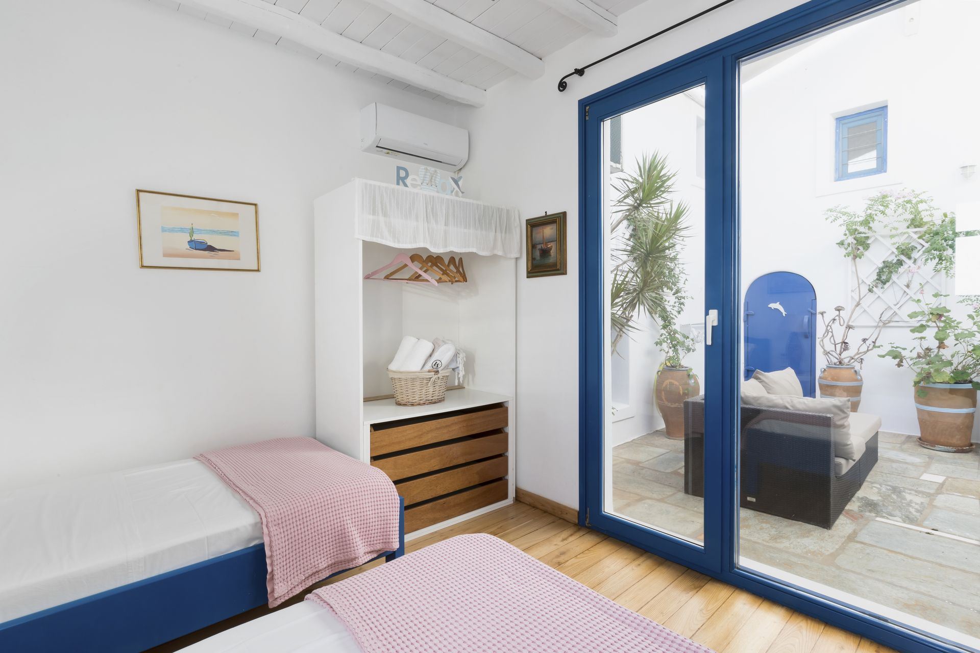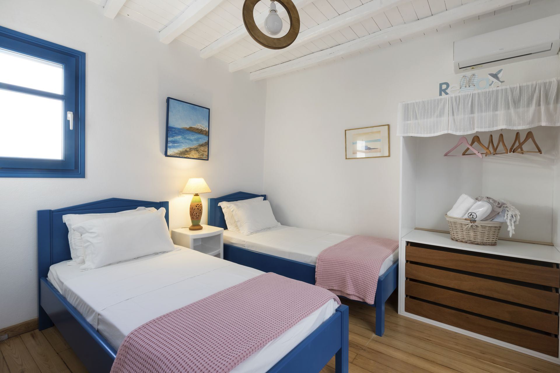 One bedroom with two single beds, en-suite bathroom