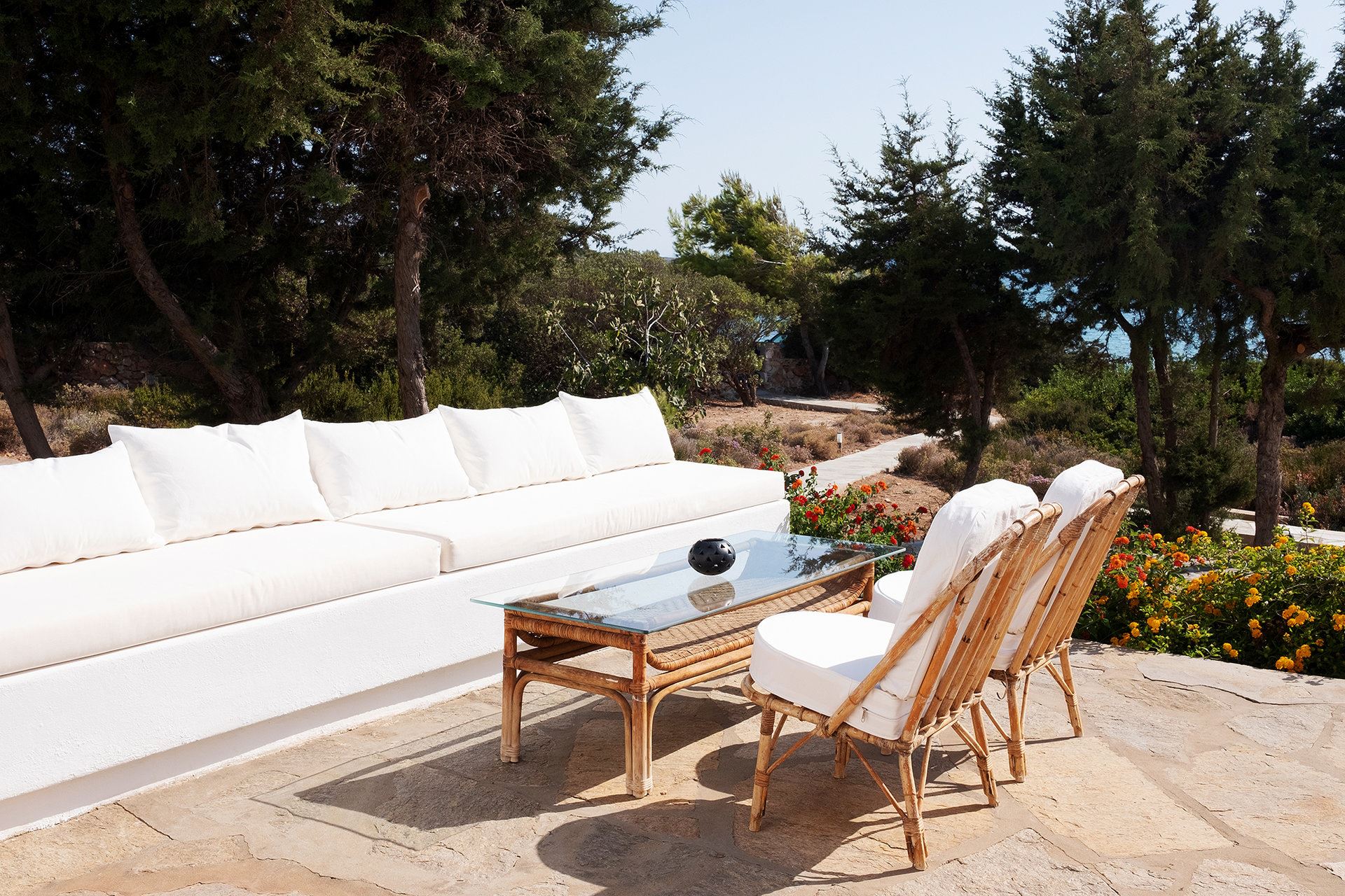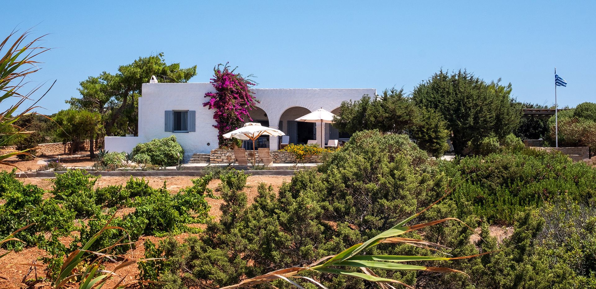 Villa Mythical is located in the captivating area of Makria Myti on the Greek island of Paros, offering a serene retreat with stunning views facing west towards Antiparos. This exclusive and private place is characterized by its limited number of private villas set within expansive properties, ensuring privacy and tranquility.