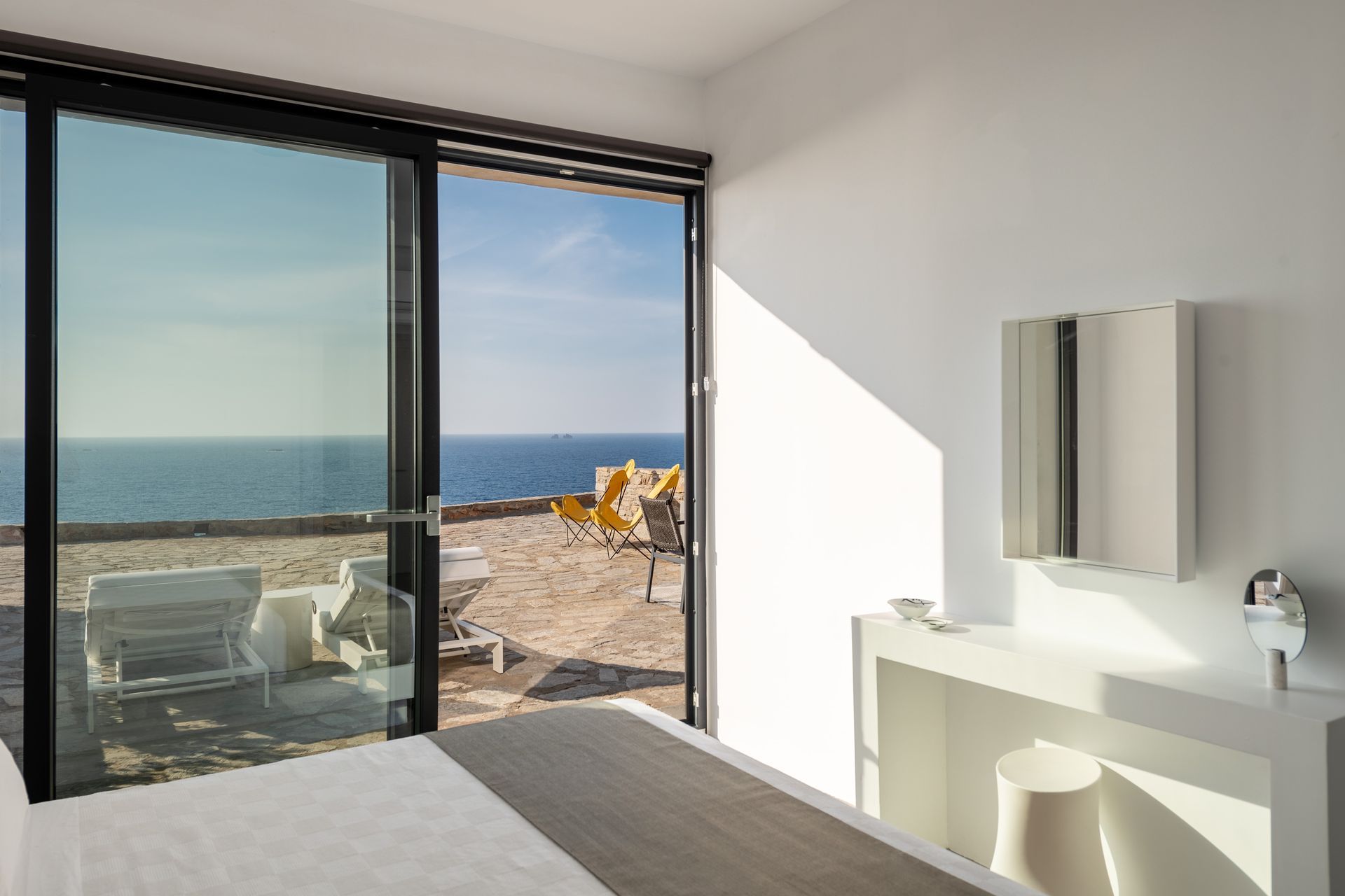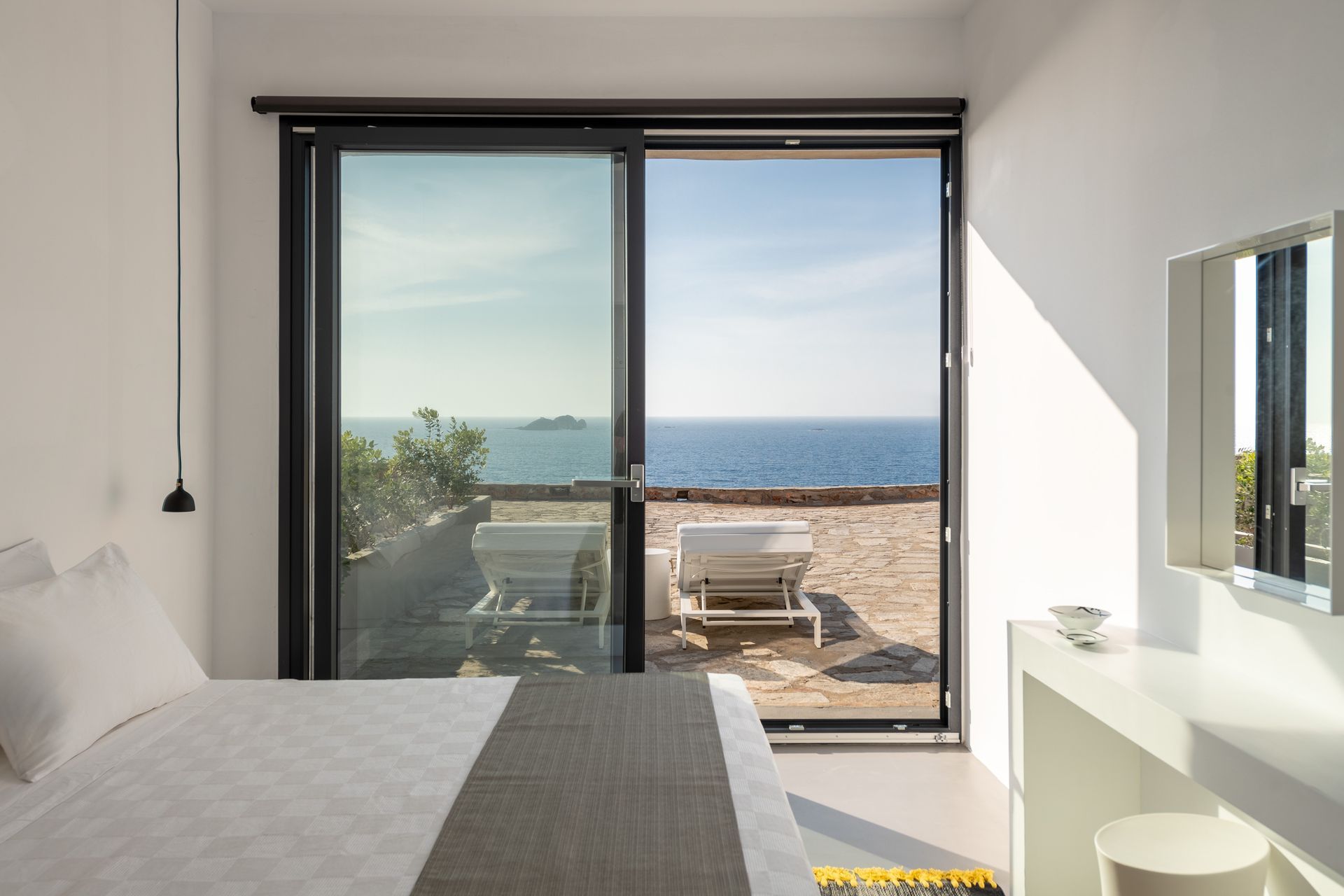 One bedroom with double bed, access to a private veranda, sea view