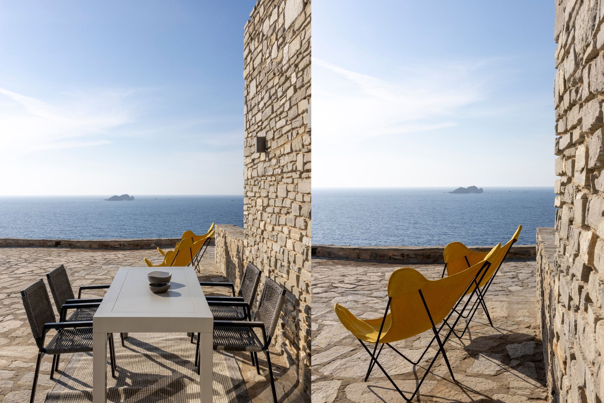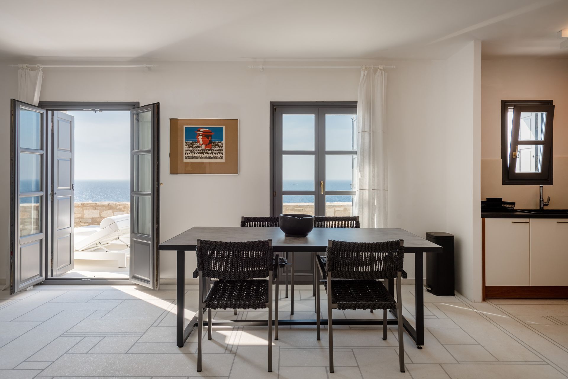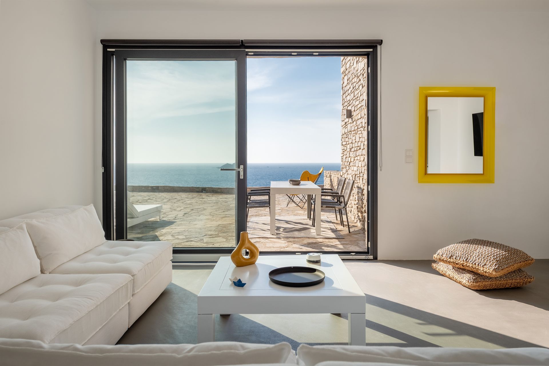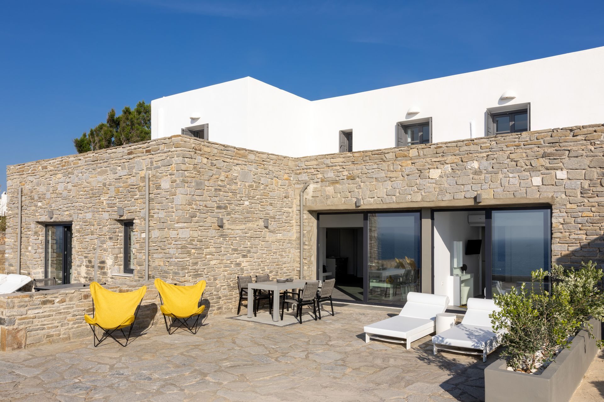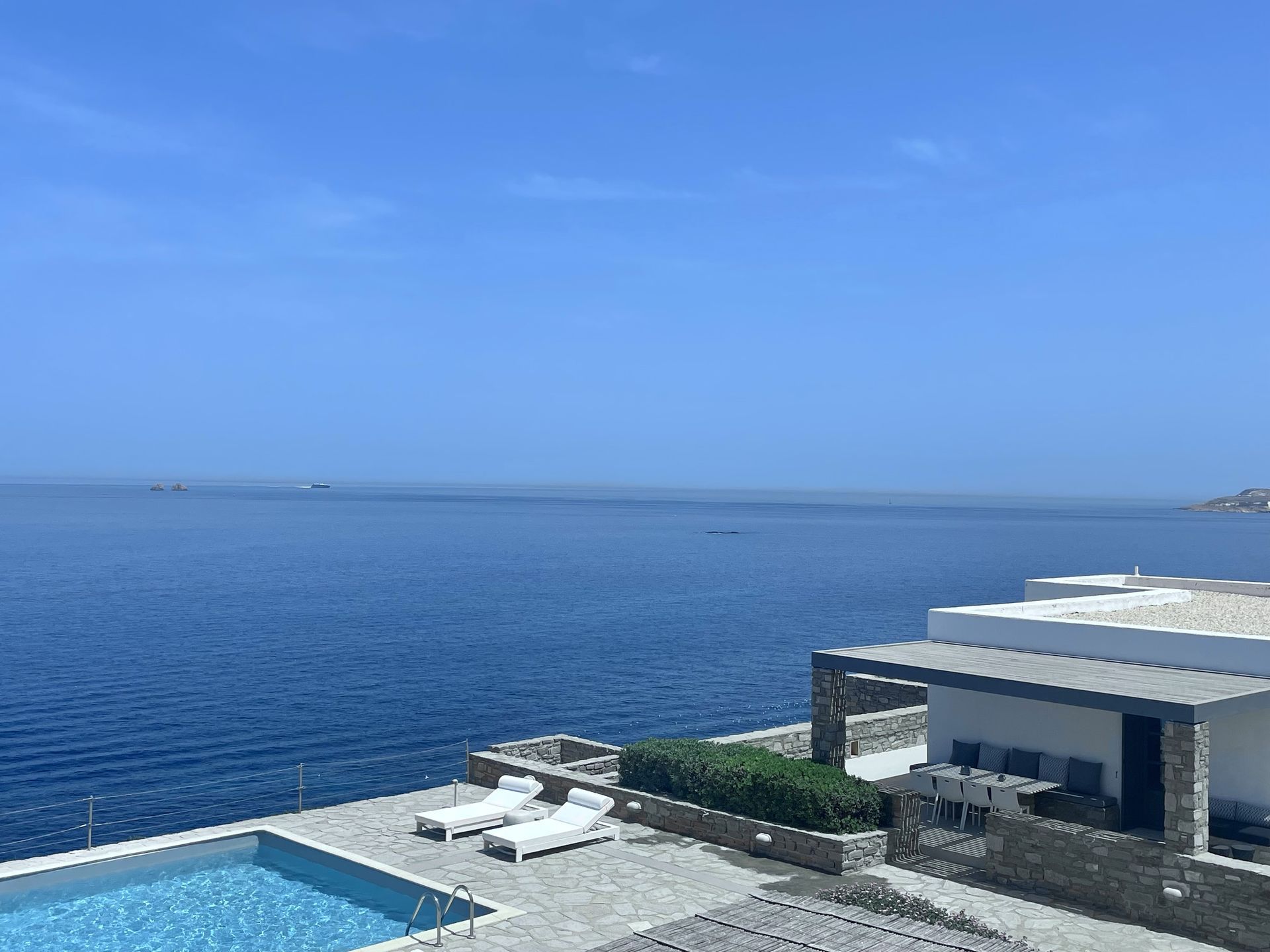 The villa’s expansive shared swimming pool area offers a serene retreat with stunning views of the Aegean Sea, perfect for relaxing under the sun or enjoying the vibrant colors of the sunset. Surrounding the pool, lovely terraces feature both dining and lounge areas, inviting guests to indulge in alfresco meals or unwind in comfort while enjoying the breathtaking ocean view.