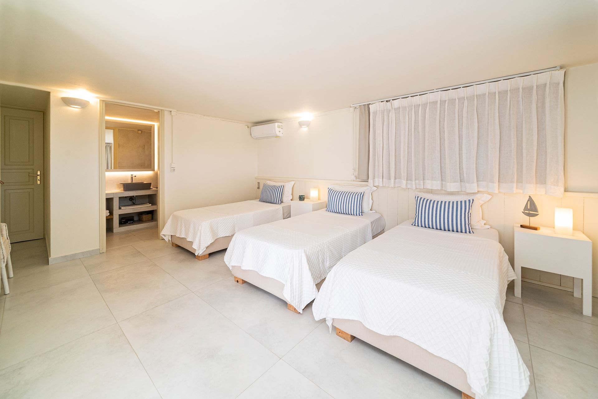 Four steps above the entrance level, the master bedroom serves as a private sanctuary with an en suite bathroom and beautiful views of the garden and sea. In addition, two lavish double bedrooms offer an elegant retreat, ensuring supreme comfort. On the lower level, an independent guesthouse adds privacy.