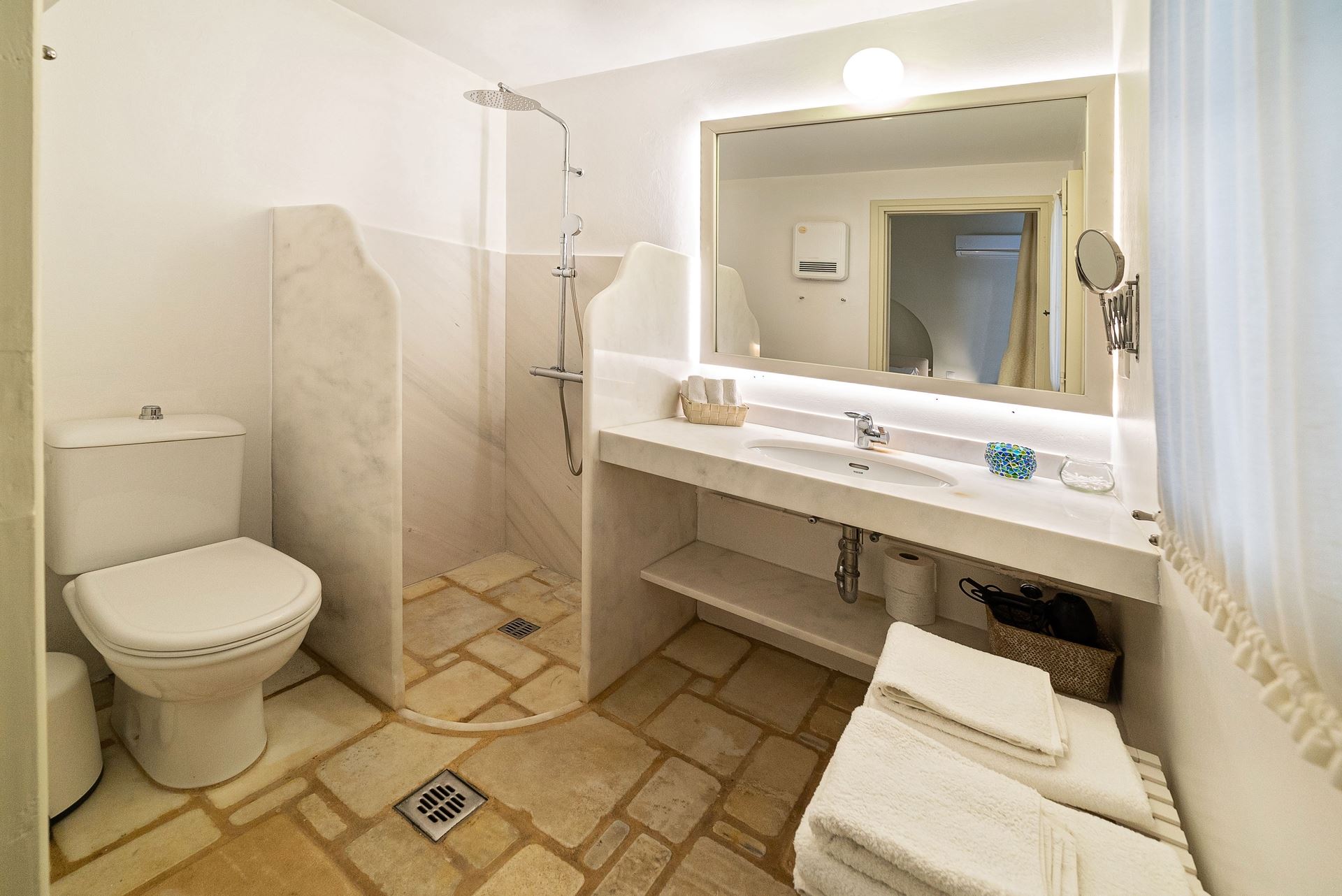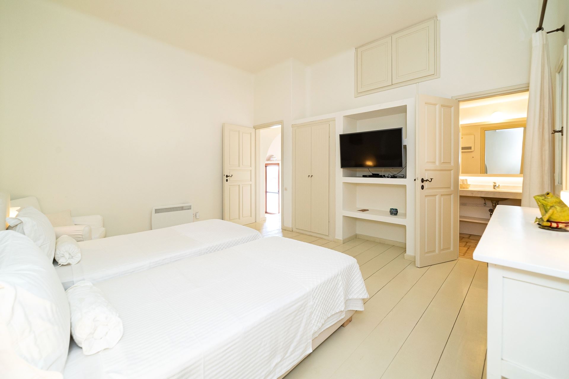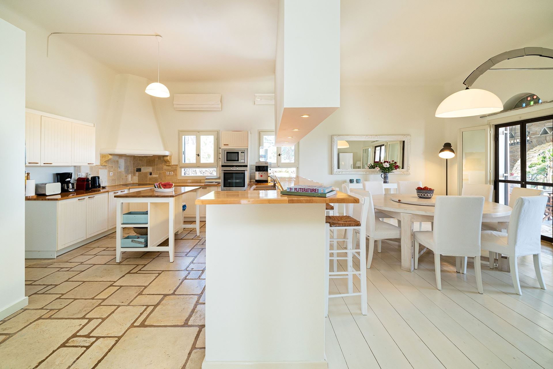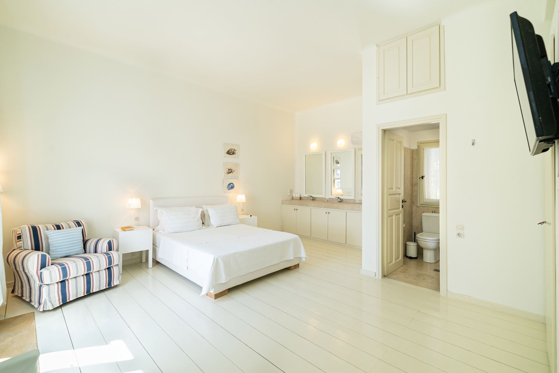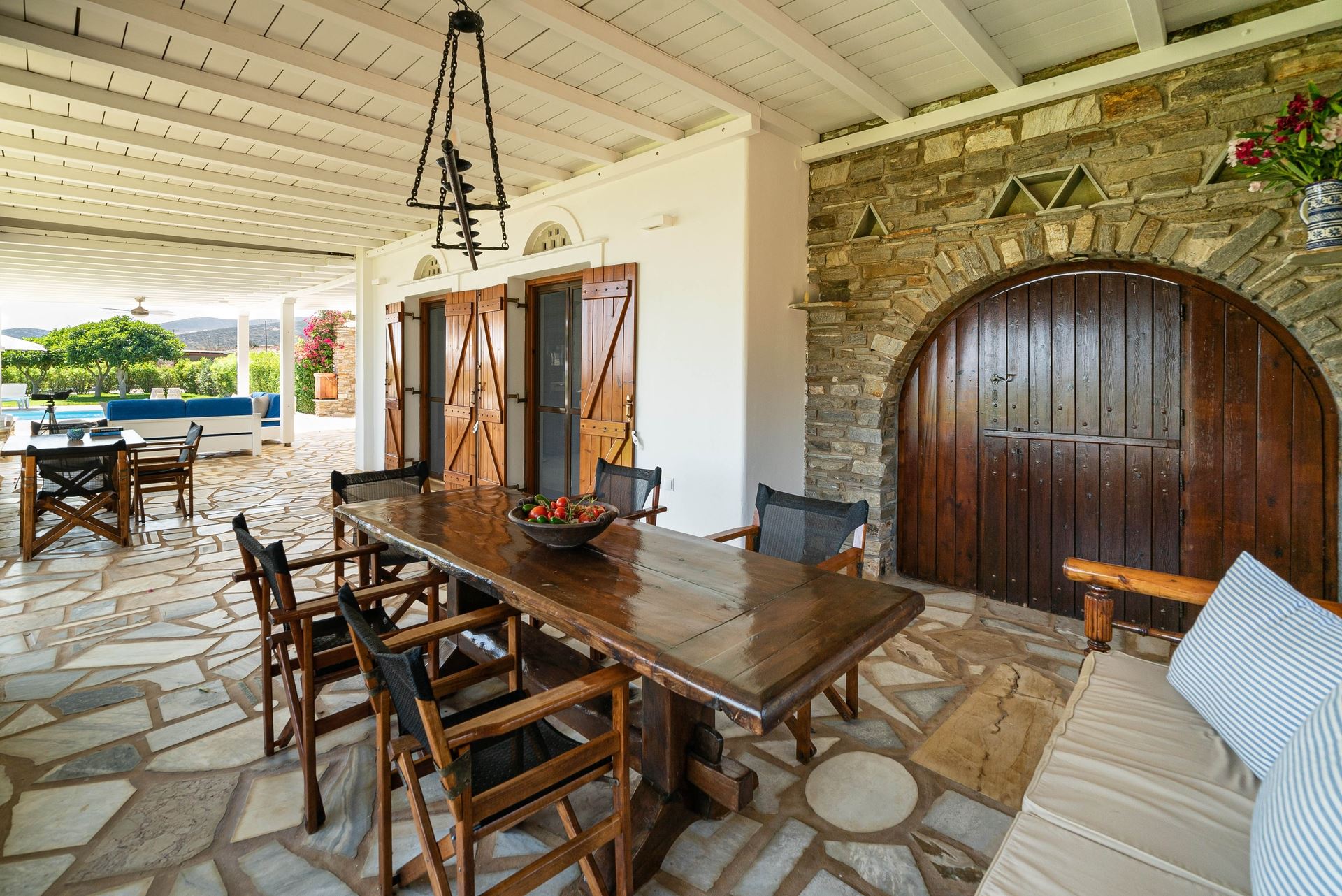 Inside, the villa exudes an elegant and Cycladic traditional atmosphere. The expansive living and dining areas are filled with natural light, offering stylish furniture that blends comfort with sophistication. The open plan design flows into a modern kitchen, fully equipped with sleek finishes and high-quality appliances, for a comfortable stay.
