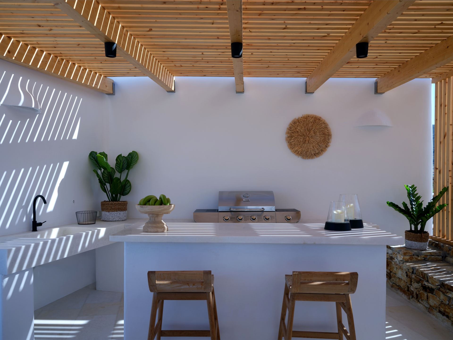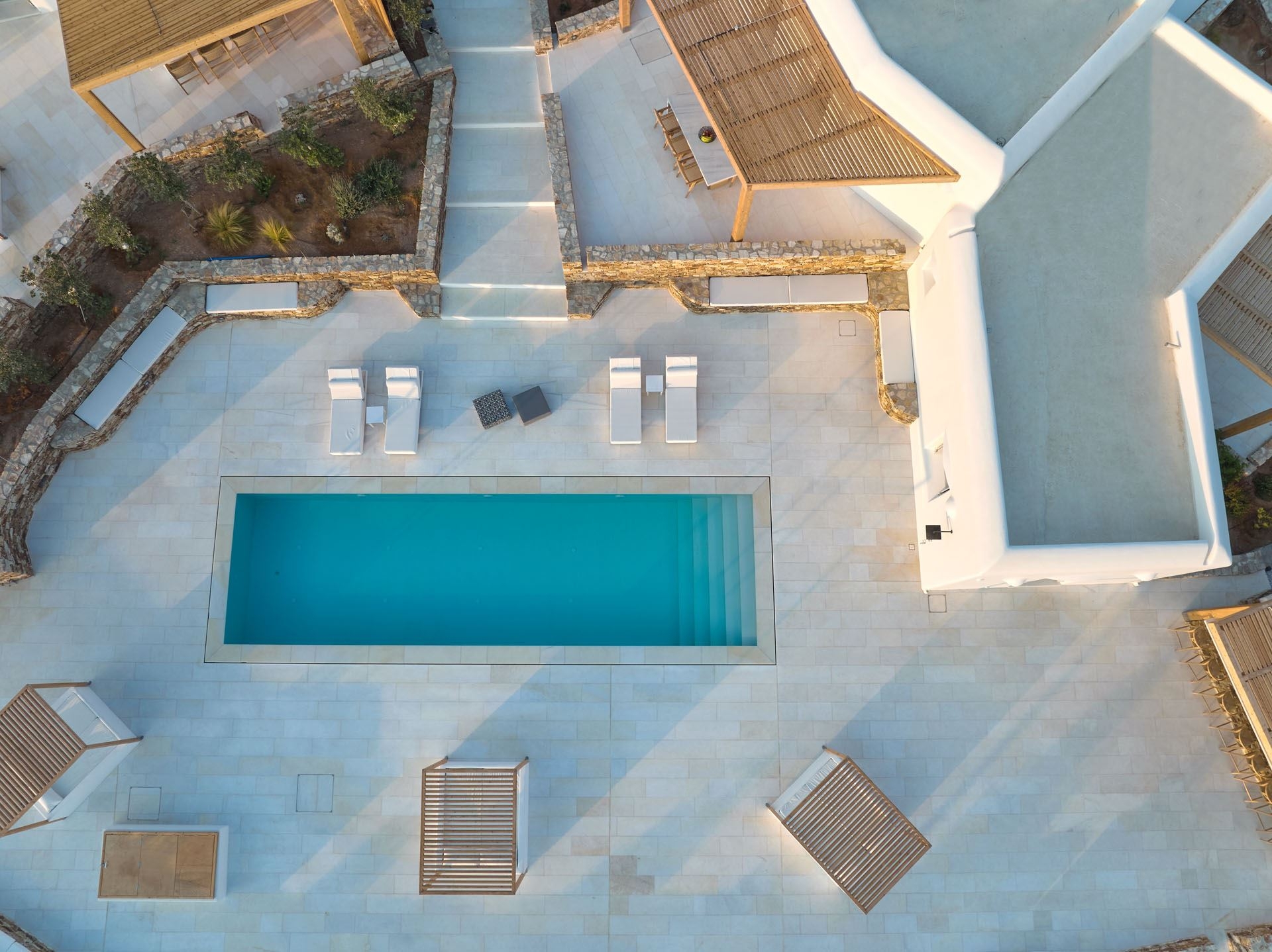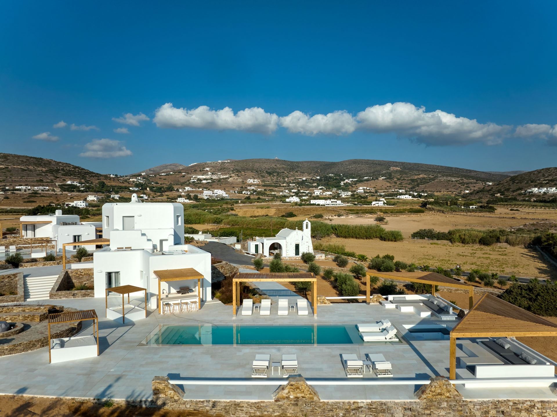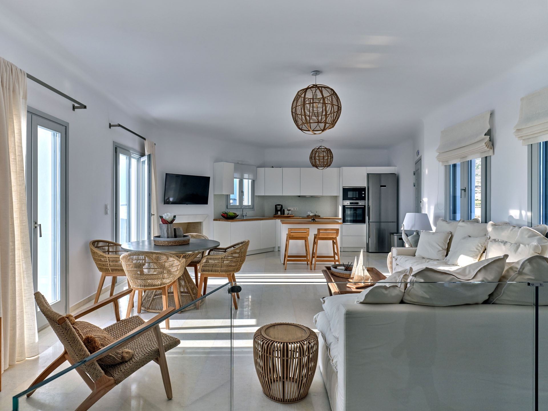 This upscale Paros rental features three spacious bedrooms, each crafted as a serene personal retreat. En suite bathrooms elevate the sense of privacy and convenience, offering a truly pampering experience.