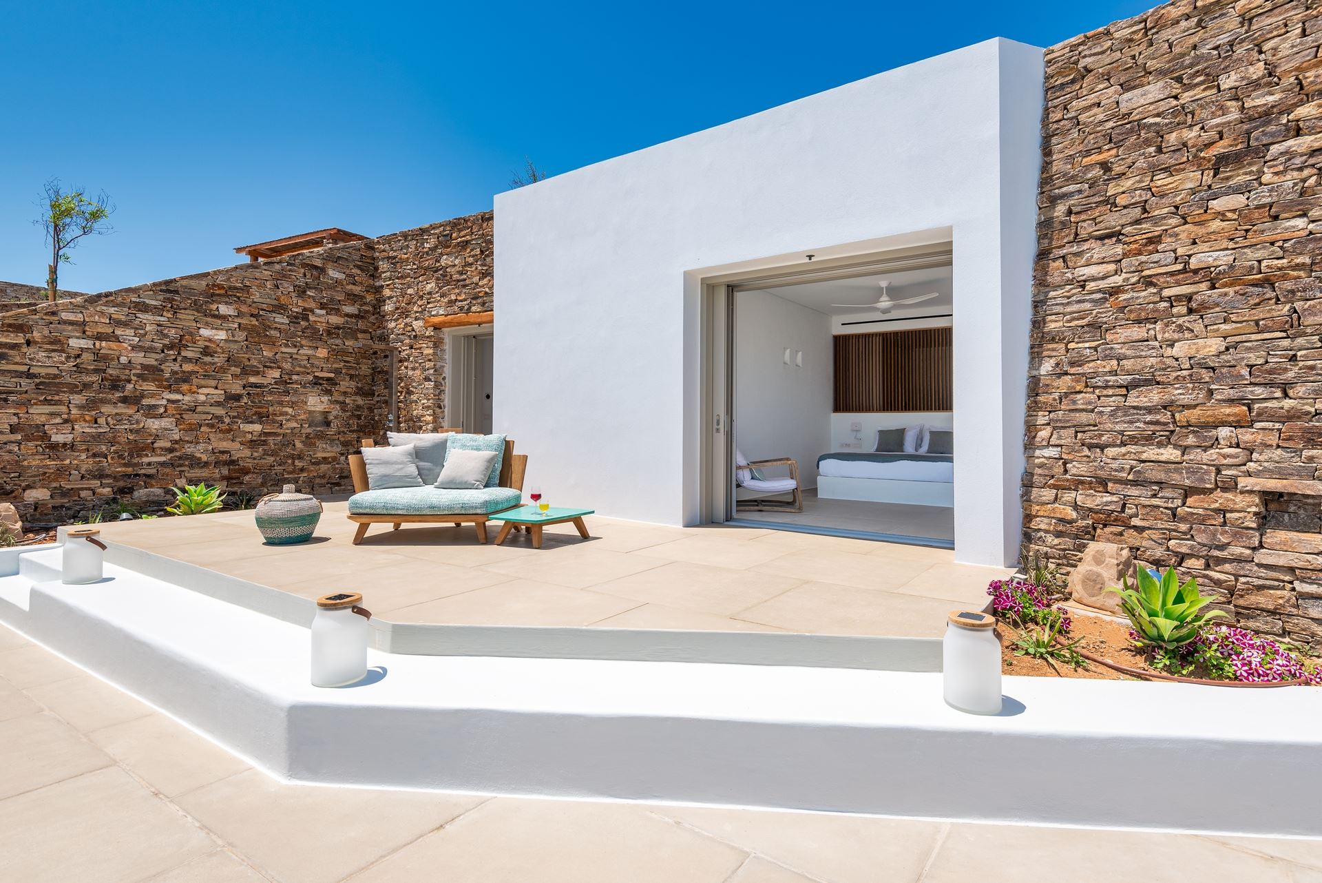 Spanning three levels, Villa Solmare in Antiparos accommodates up to 14 guests in seven exquisite bedrooms, each with en suite bathrooms and stunning sea views. The villa’s design emphasizes harmony with the surroundings, incorporating green roofs, natural stone, and an open-air layout that allows for seamless indoor-outdoor living. The panoramic views stretch across the canal between Paros and Antiparos, reaching as far as Syros, Mykonos, Ios, and Iraklia.