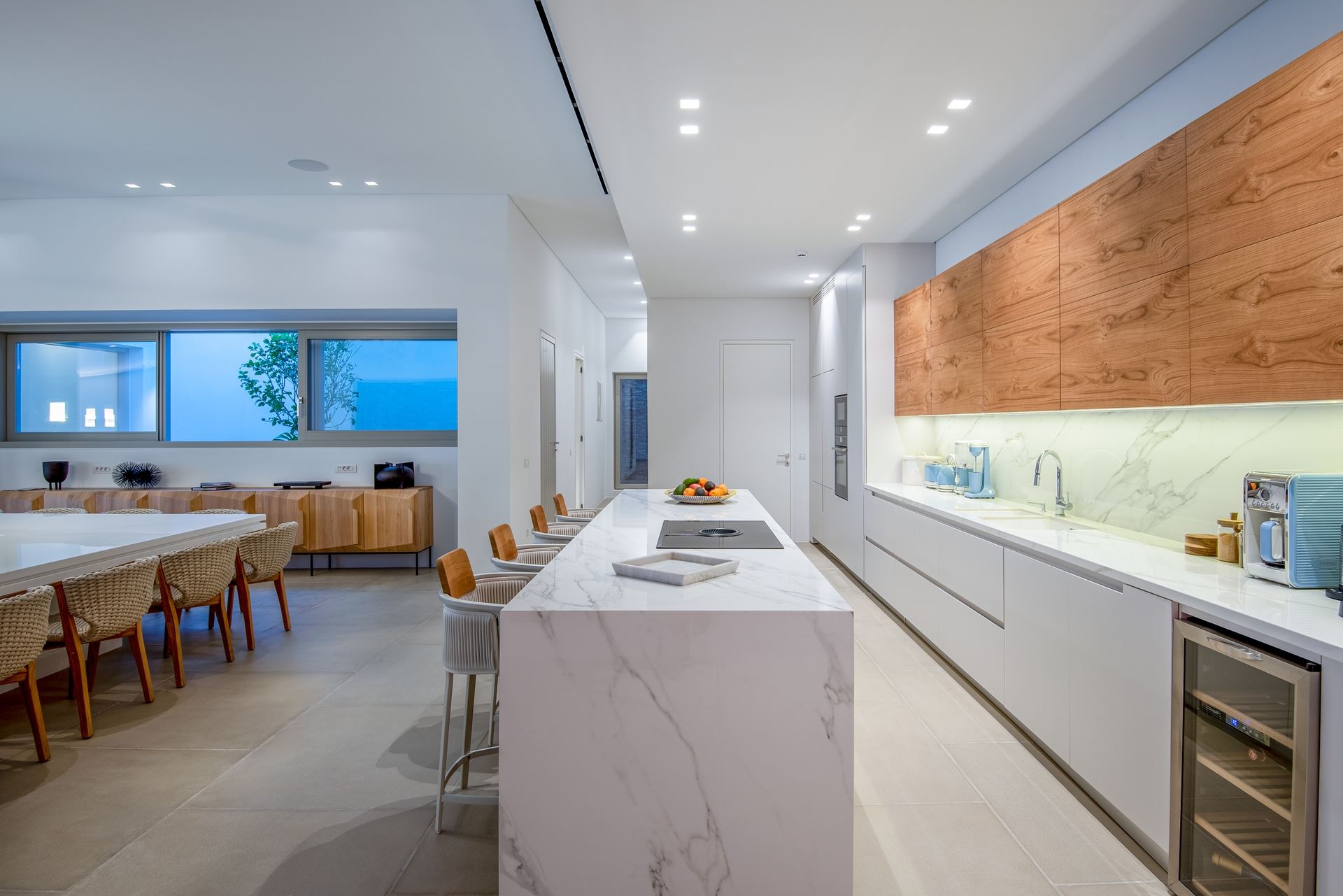The outdoor spaces are equally impressive, featuring two private swimming pools, expansive terraces, and multiple shaded lounges for relaxation. A fully equipped outdoor bar, BBQ area, and dining space provide the perfect setting for entertaining against a backdrop of spectacular sunsets. The villa also boasts a gym with a private shower, an outdoor shower area, and a dedicated staff room. Thoughtfully designed shaded areas ensure comfort throughout the day, while the elegant belvedere offers an ideal spot to admire the breathtaking scenery.