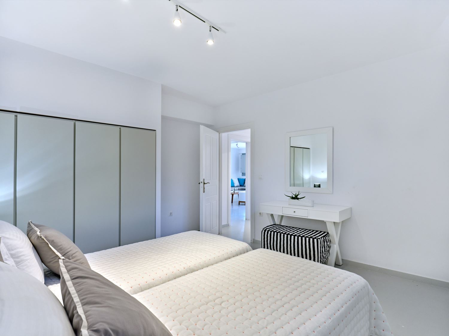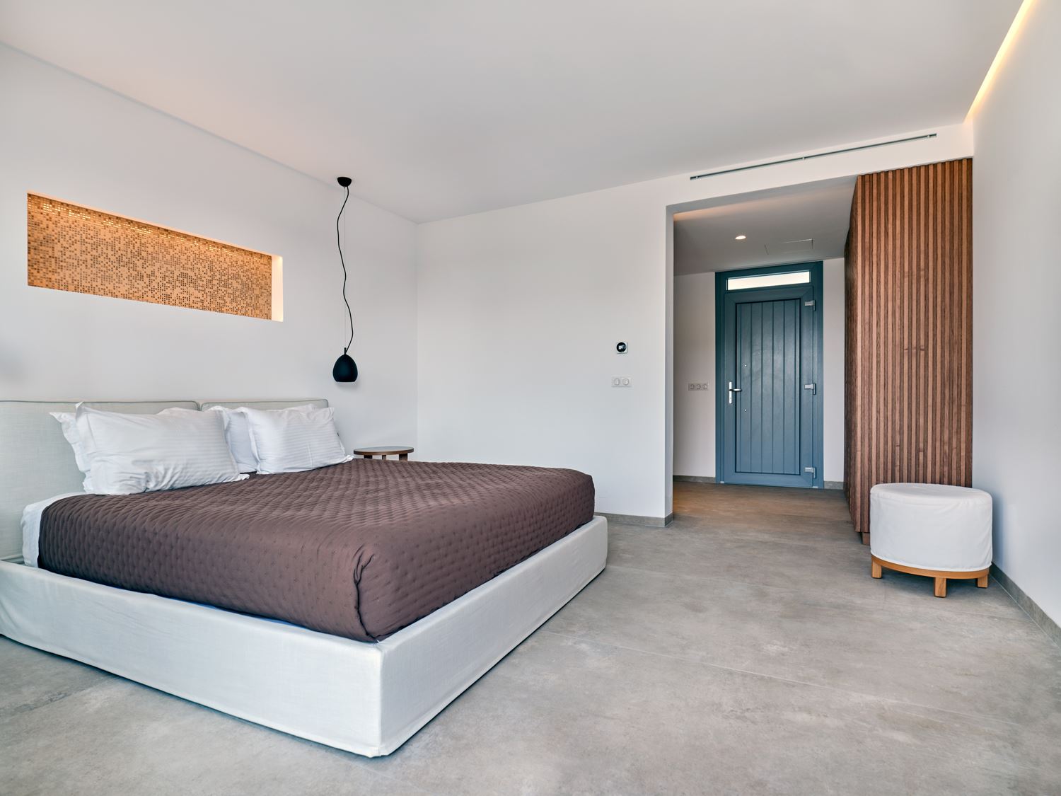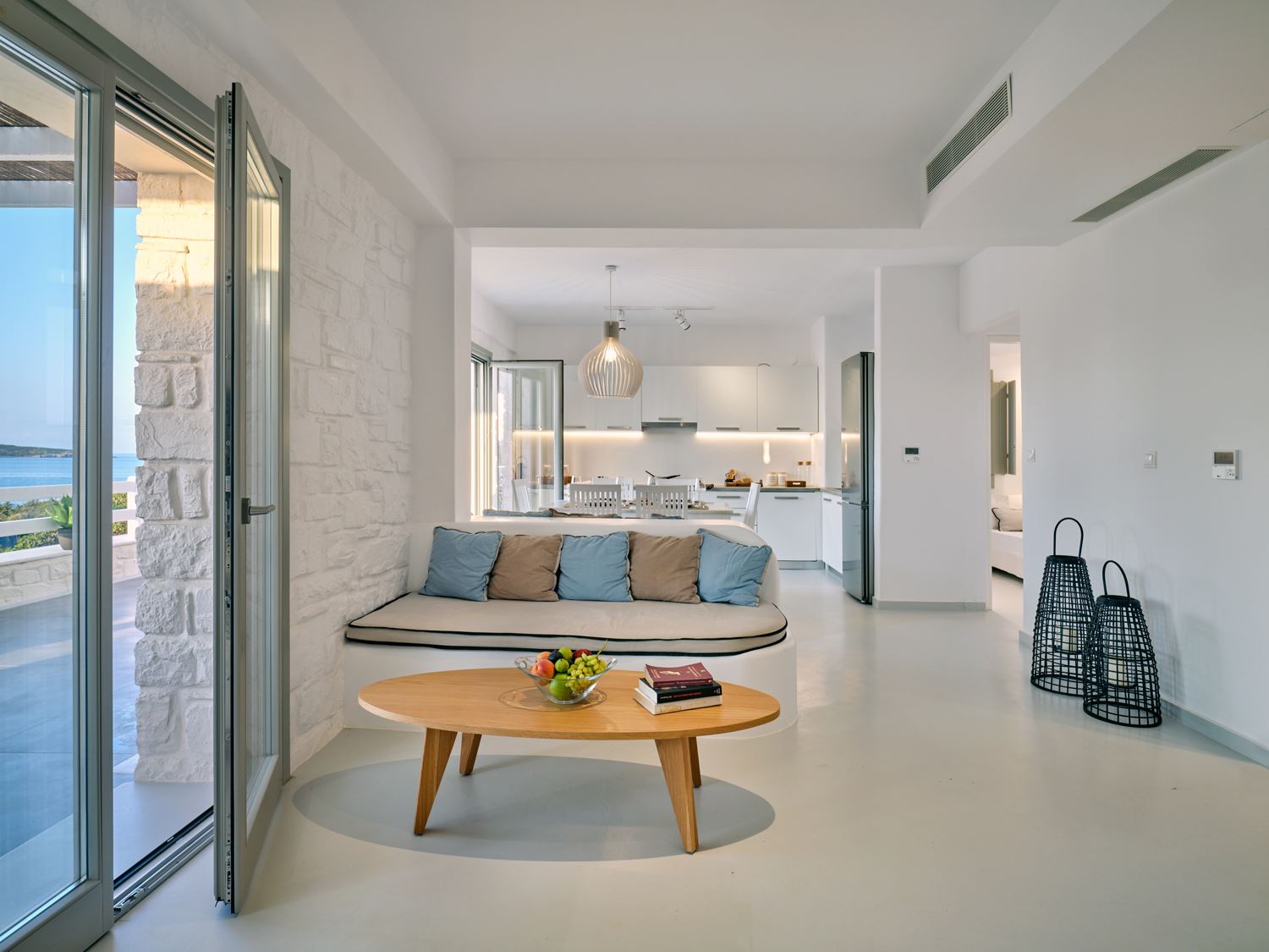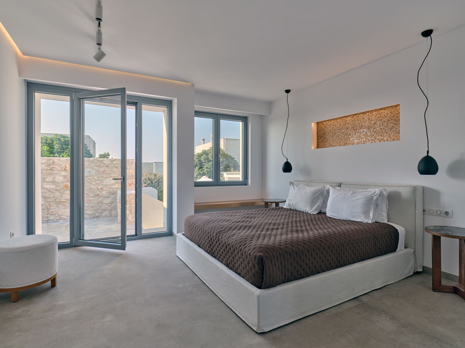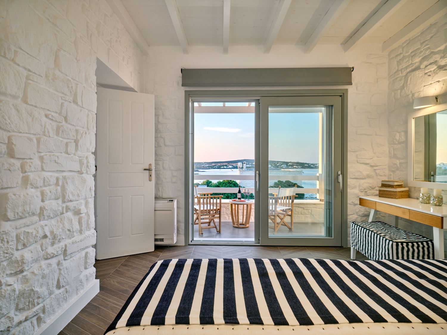 Next to the entrance level, guests will find the entrance to the luxury suite, designed to accommodate friends or family. This spacious bedroom features an en-suite bathroom and a private balcony with direct access to the pool and gardens. On the top level of Villa Violet, the grand master bedroom offers ultimate comfort. With a separate living area, an en-suite bathroom, and a private balcony with panoramic views of the bay and Naxos, it promises an exceptional stay.