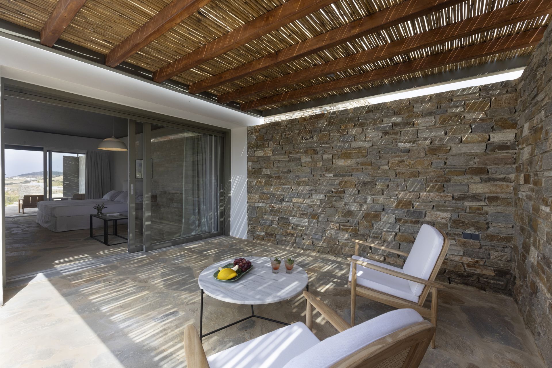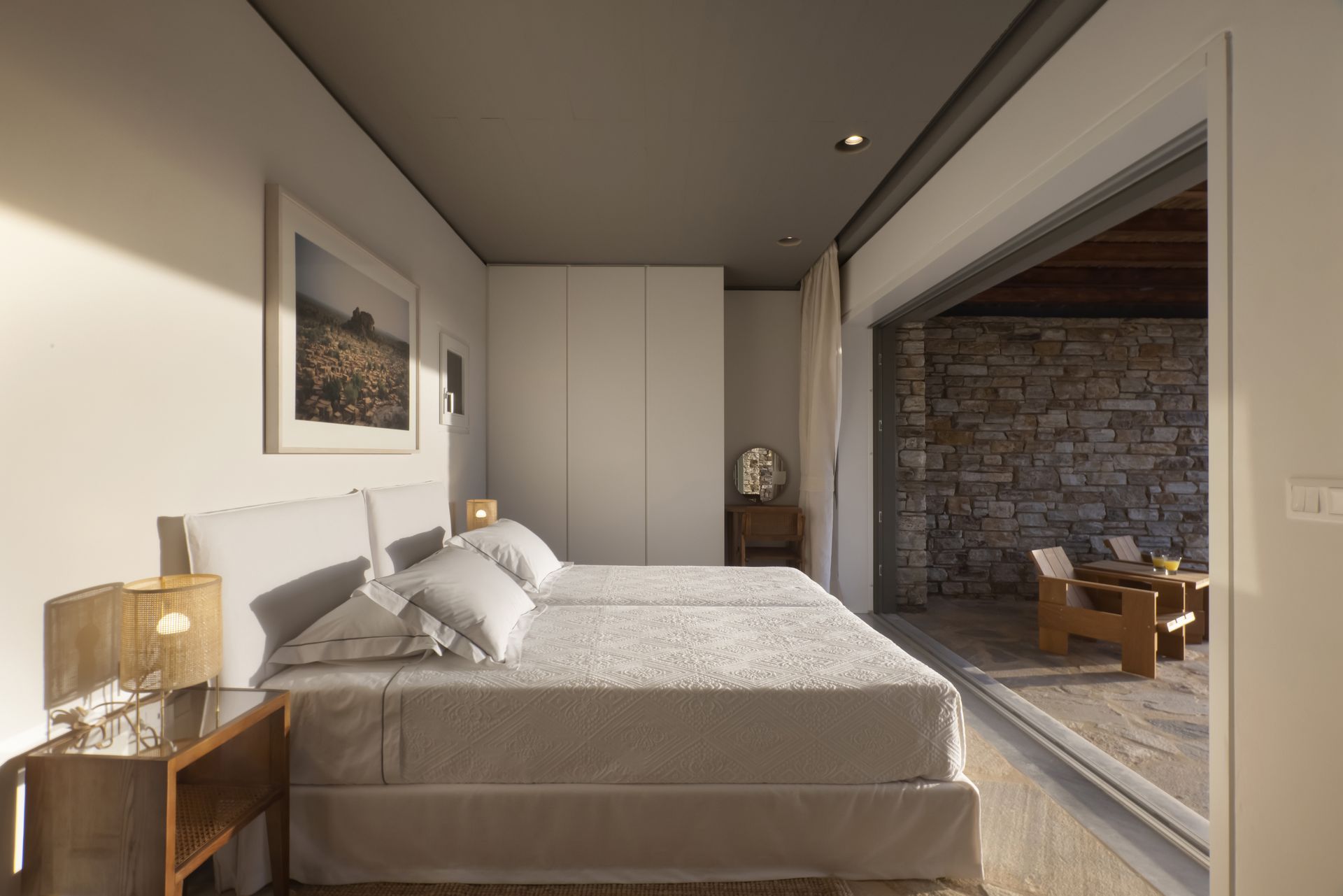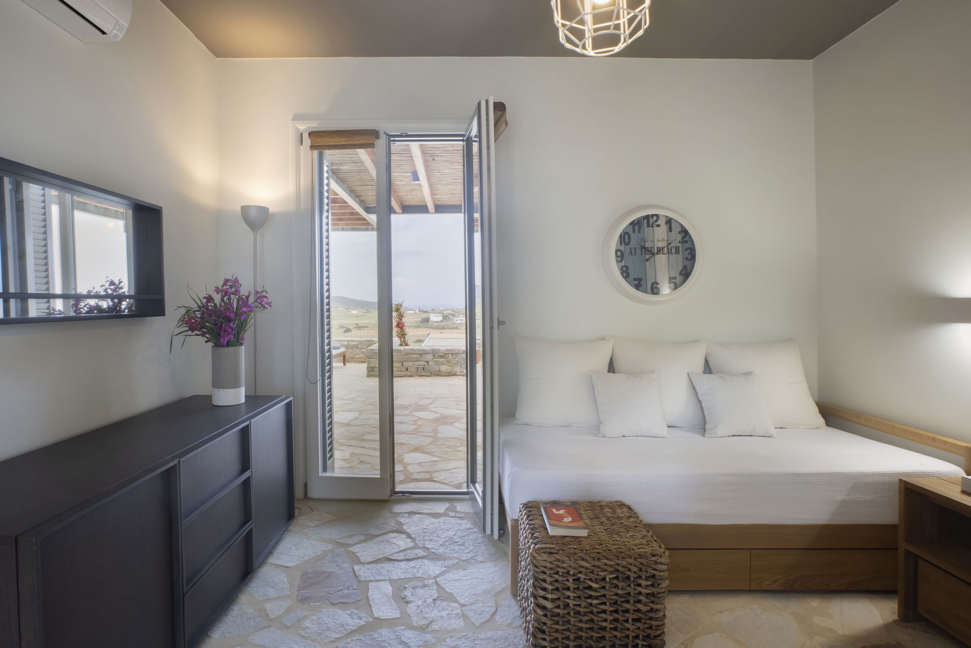 Villa Zen for rent in Antiparos accommodates up to 12 guests, with additional space for 4 more. It has six bedrooms and also two extra rooms, making that every guest feel comfortable. Furthermore, there are six stylish bathrooms, designed for convenience and elegance. The villa’s single level layout allows for smooth transitions between the indoor and outdoor spaces, enhancing the overall experience.