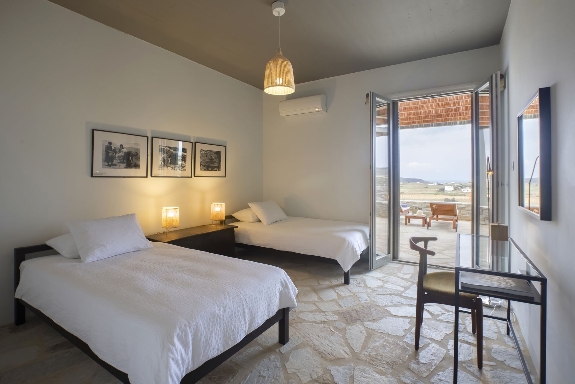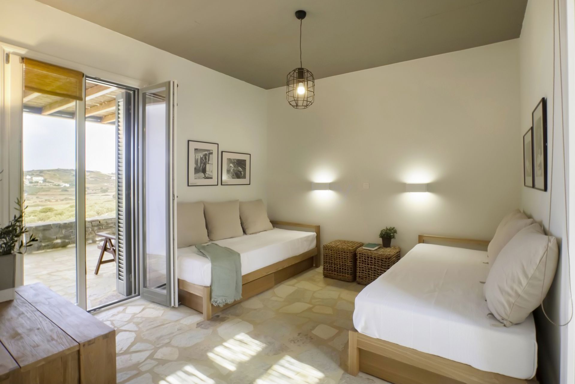 Two bedrooms with two single beds, shared bathroom, direct access to the private terrace